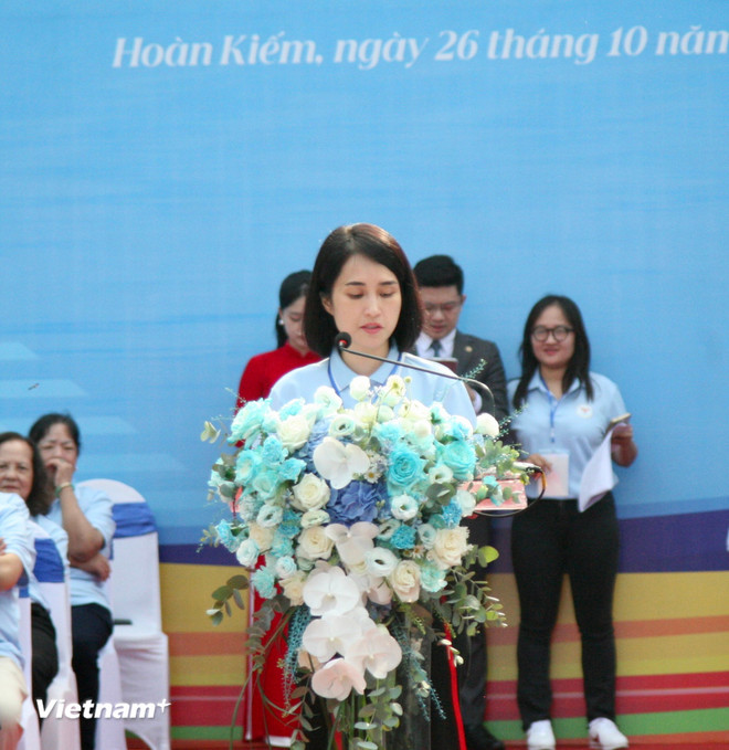 Bà Nguyễn Hồng Trang - Phó Chủ tịch Ủy ban Nhân dân phường Hoàn Kiếm phát biểu khai mạc Đại hội. (Trịnh Huyền/Vietnam+)