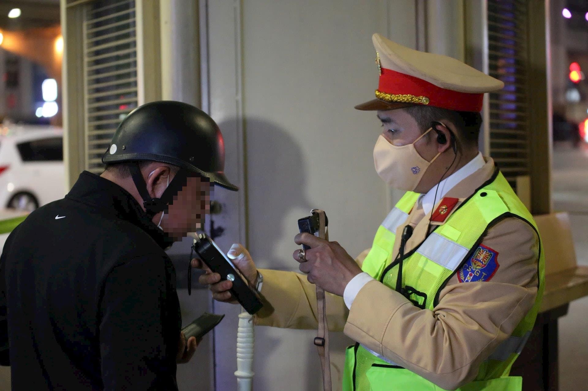 Đội Cảnh sát giao thông đường bộ số 7 kiểm soát nồng độ cồn trong tối 14-2. Ảnh: NT