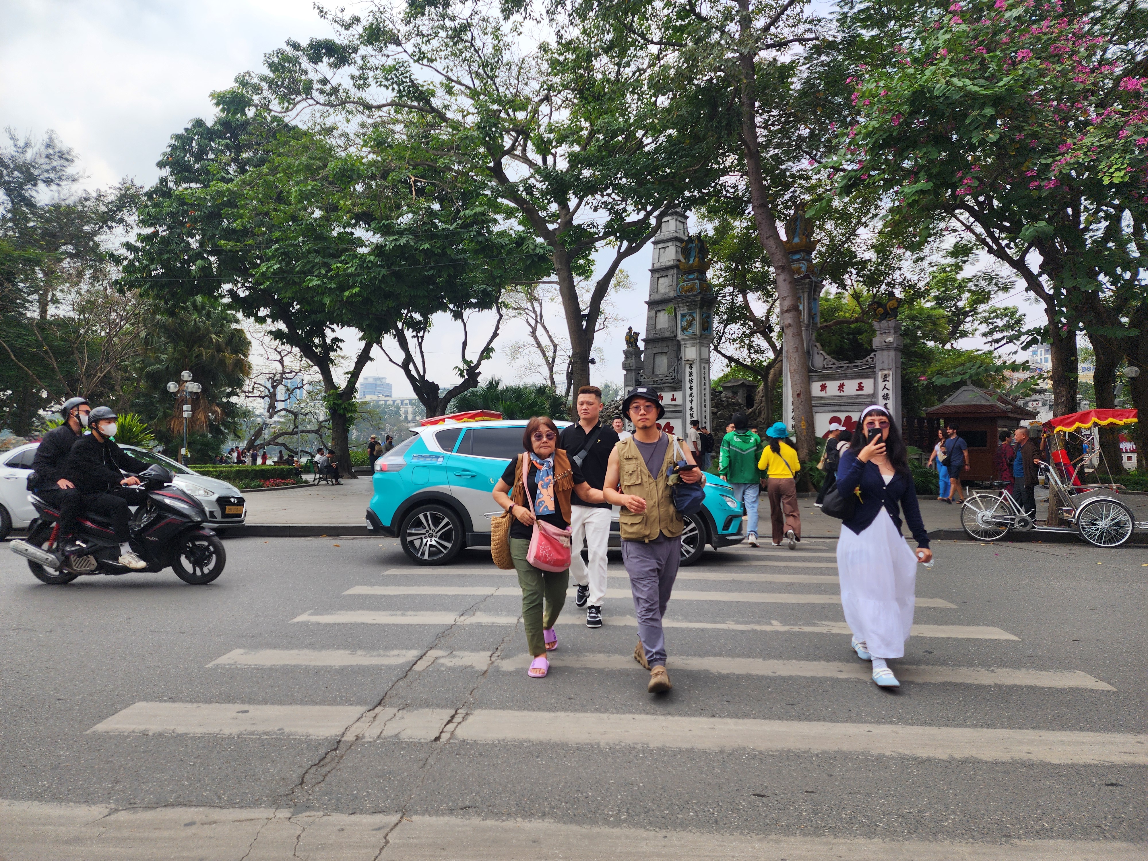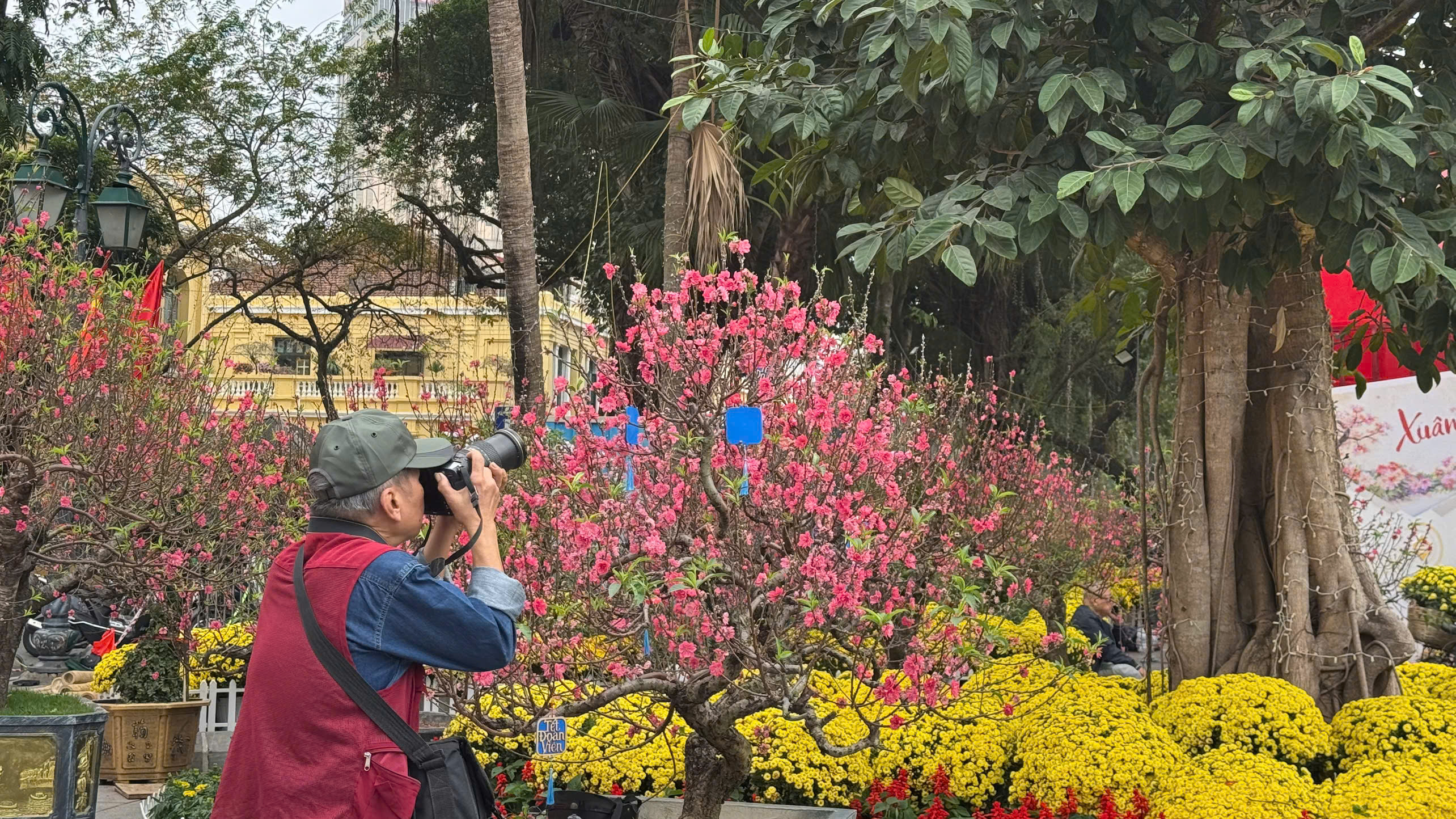 Trên nhiều tuyến phố, người dân tranh thủ dạo chơi, chụp ảnh. Nhiều gia đình đưa con đi ngắm hoa; trẻ nhỏ diện áo dài, cầm bao lì xì hoặc cành đào nhỏ. Một số quán cà phê khu trung tâm đông khách nhưng không quá ồn ào.