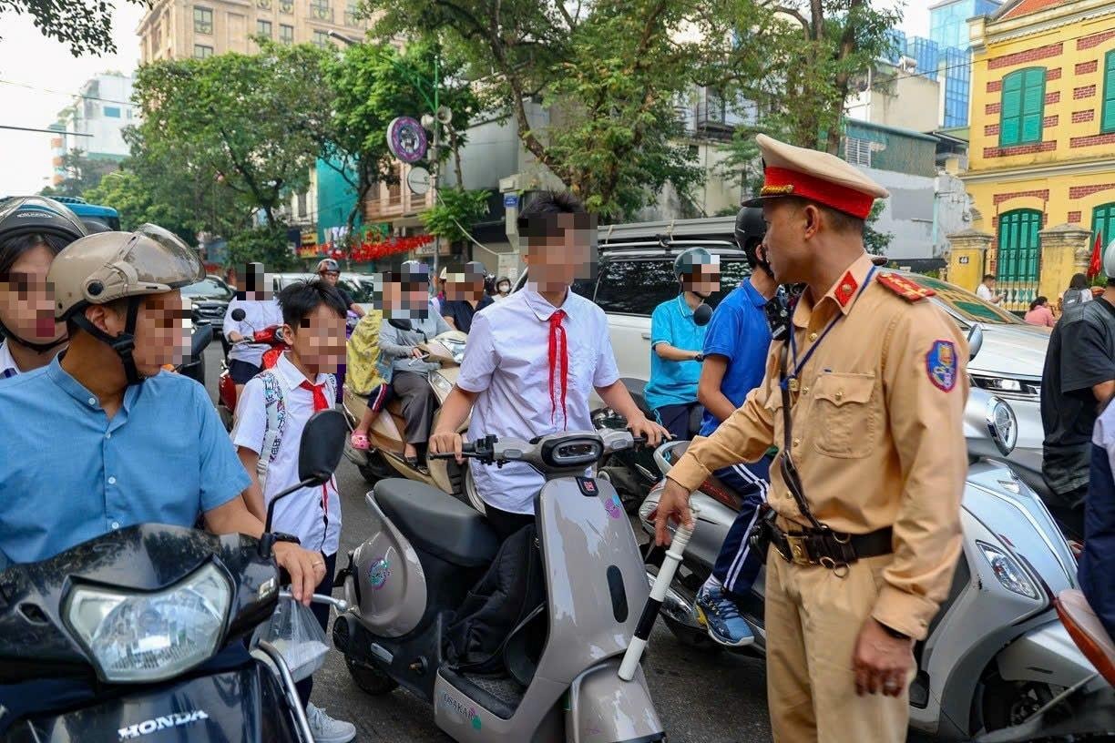 Cảnh sát giao thông Hà Nội xử lý học sinh điều khiển xe không đội mũ bảo hiểm khi tham gia giao thông.