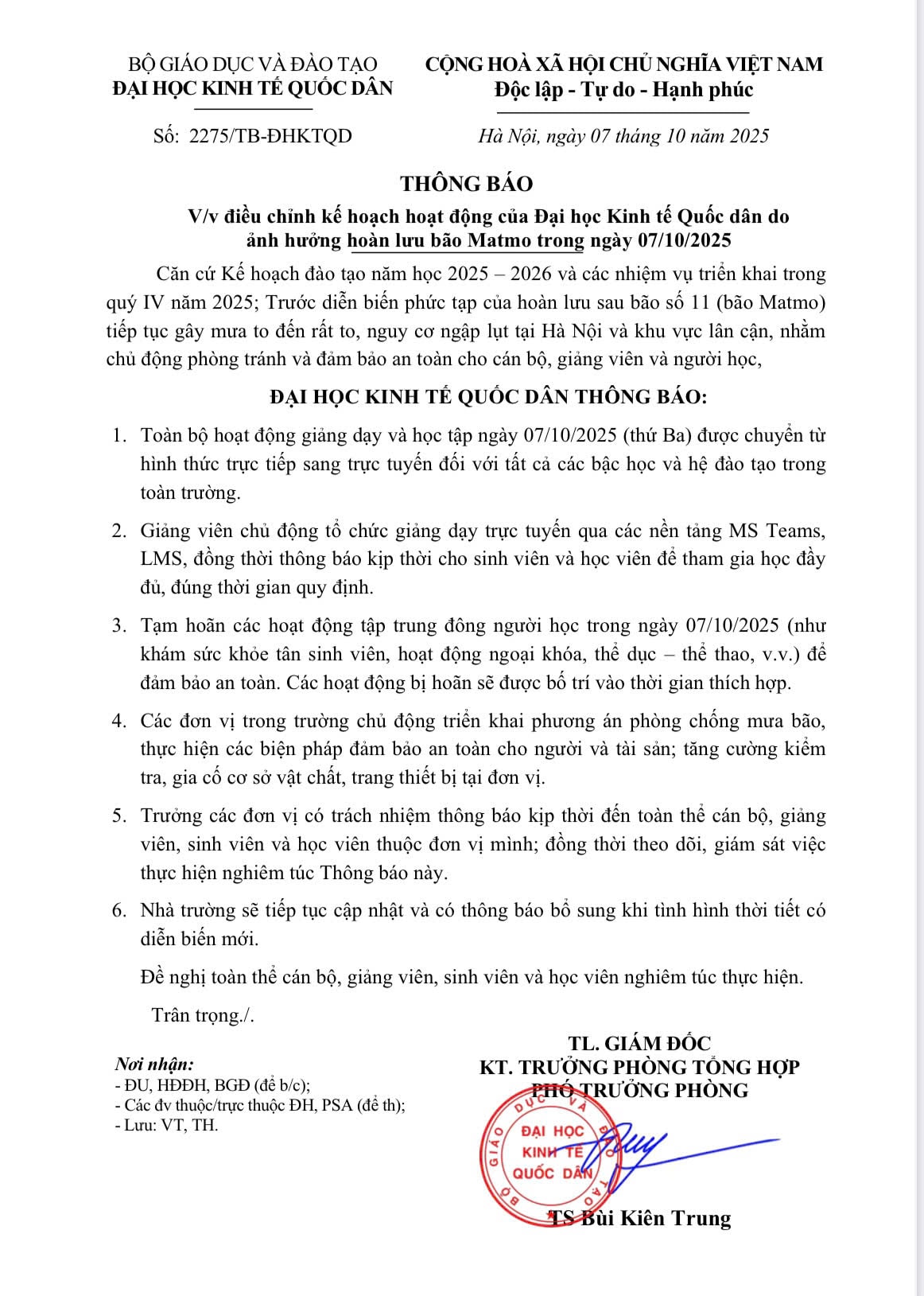 Ở bậc đại học, các trường đồng loạt kích hoạt phương án an toàn. Đại học Kinh tế Quốc dân thông báo chuyển toàn bộ hoạt động giảng dạy sang trực tuyến để đảm bảo an toàn di chuyển cho giảng viên và sinh viên, đồng thời lưu ý những trường hợp buộc phải di chuyển qua khu vực ngập cần hết sức cẩn trọng.