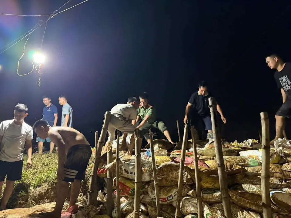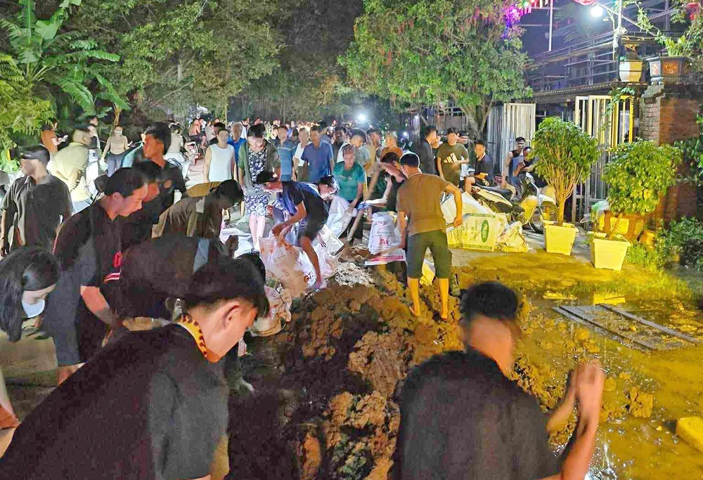 Đêm ngày 8-10, chính quyền xã Đa Phúc huy động lực lượng tại chỗ và người dân sử dụng bao tải đất để đắp bờ, gia cố đê Tân Hưng đề phòng lũ tràn vào khu dân cư. Ảnh người dân cung cấp.
