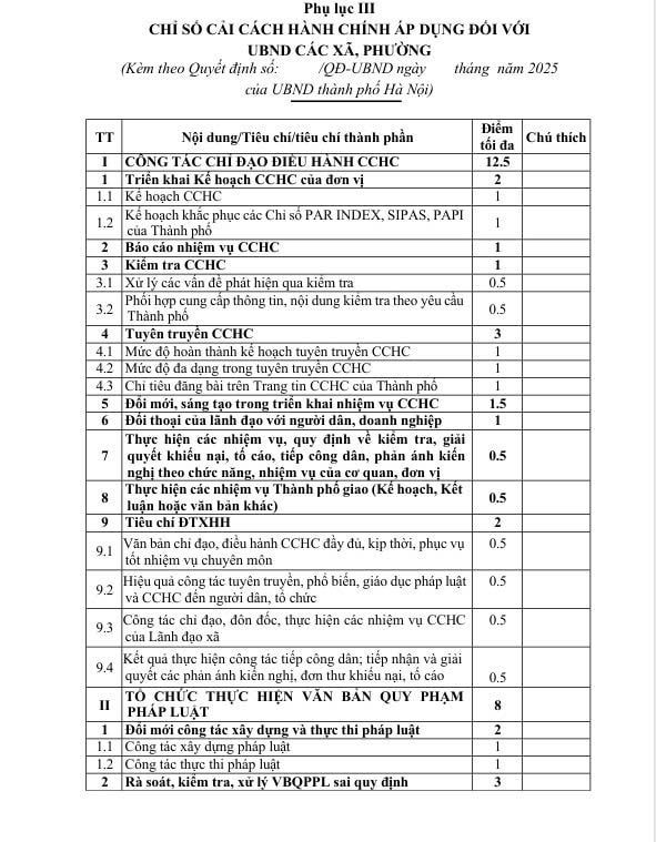 Bộ tiêu chí xác định Chỉ số CCHC áp dụng cho các sở, các xã được cấu trúc thành 8 trục nội dung đánh giá và 1 nội dung điểm thưởng, điểm trừ, gồm: (1) Công tác chỉ đạo, điều hành CCHC; (2) Cải cách thể chế; (3) Cải cách thủ tục hành chính và thực hiện cơ chế một cửa, một cửa liên thông; (4) Cải cách tổ chức bộ máy; (5) Cải cách chế độ công vụ; (6) Cải cách tài chính công; (7) Xây dựng và phát triển chính quyền điện tử, chính quyền số; (8) Tác động CCHC đến phát triển kinh tế - xã hội của thành phố; (9) Nội dung điểm thưởng và điểm trừ trong công tác CCHC.