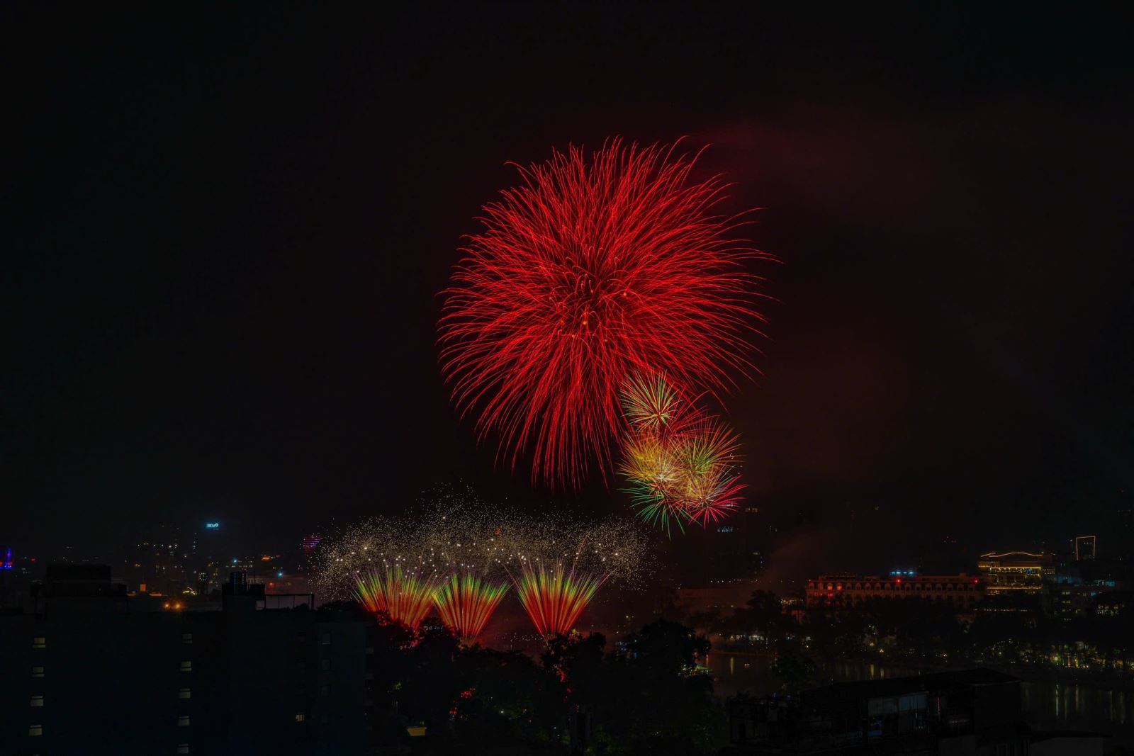 Trận địa pháo hoa tại hồ Hoàn Kiếm trong đêm giao thừa Tết Dương lịch 2026.
