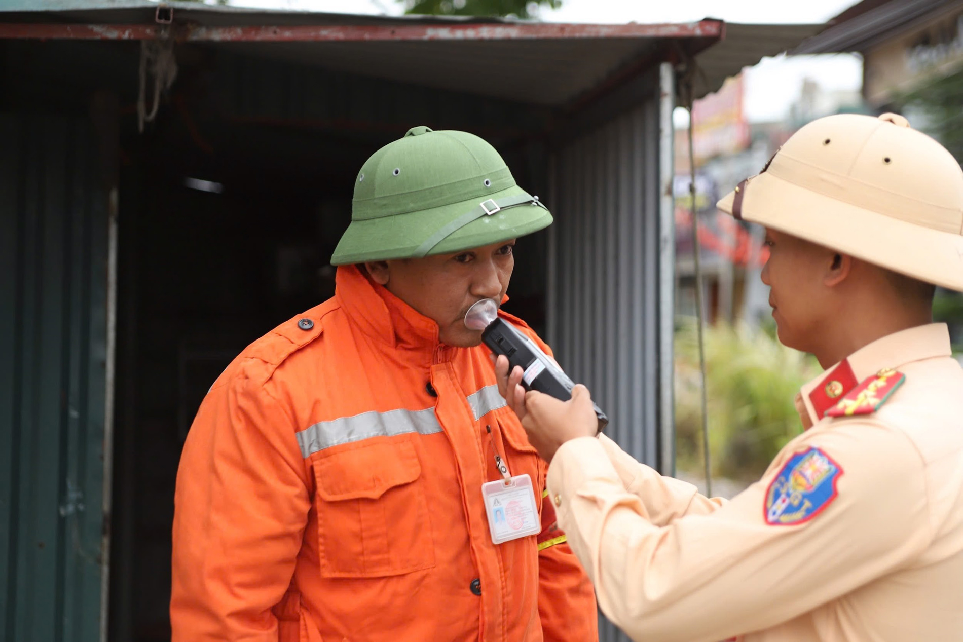 CSGT kiểm tra nồng độ cồn với nhân viên gác chắn.