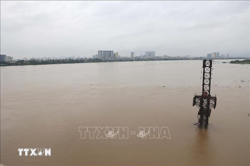 Mực nước sông Hồng đoạn chảy qua Thủ đô Hà Nội dâng cao chịu ảnh hưởng liên tiếp mưa lớn từ cơn bão số 10 và hoàn lưu vùng áp thấp suy yếu từ cơn bão số 11. (Ảnh: Vũ Quang Đán/TTXVN)