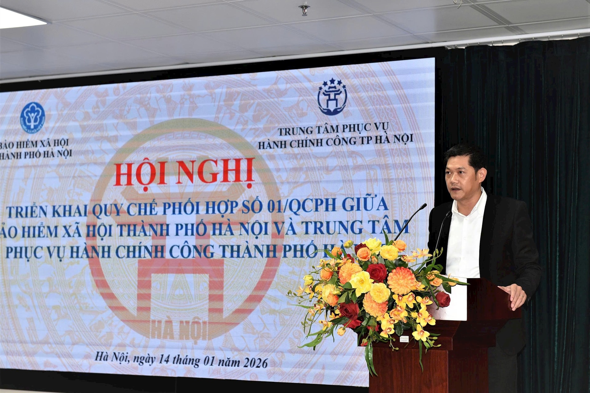 Phó Giám đốc BHXH thành phố Nguyễn Công Định rình bày chi tiết về Quy chế phối hợp số 01/QCPH-TTPVHCC-BHXH. Ảnh: Ngọc Tư
