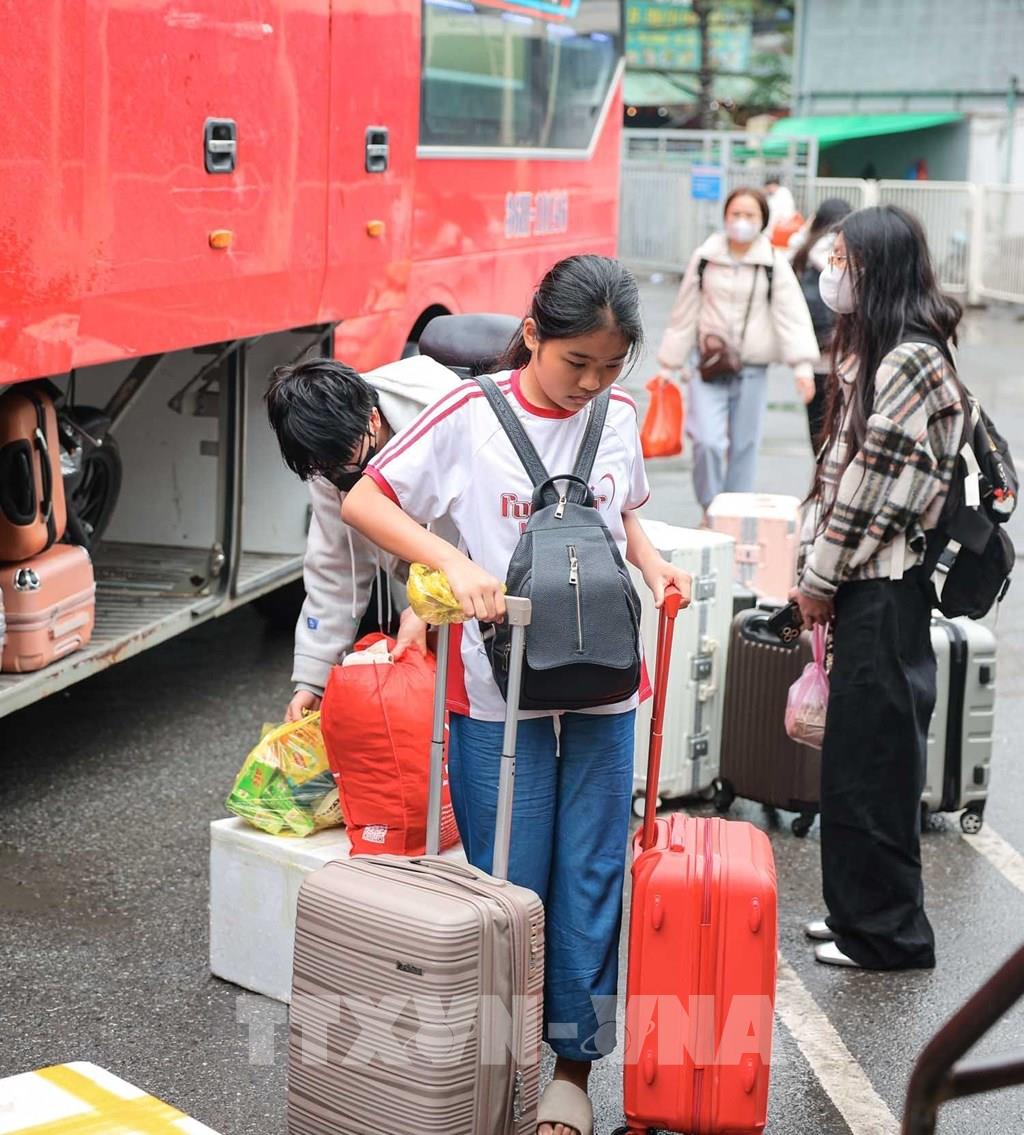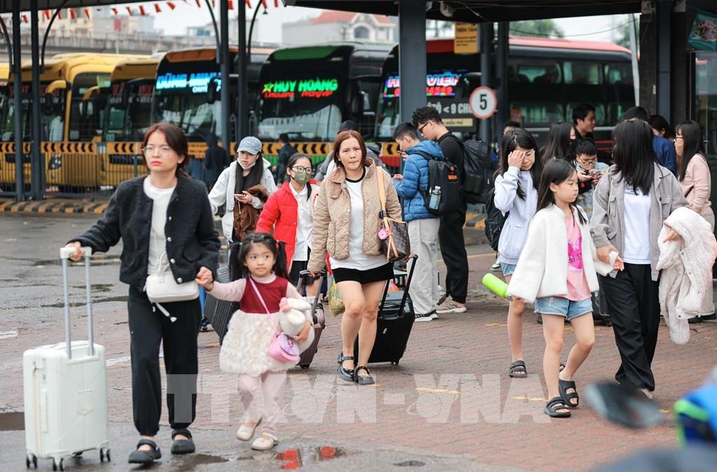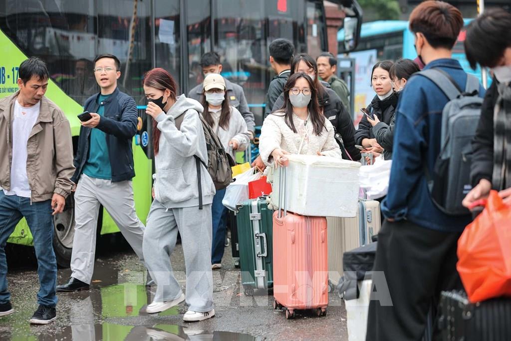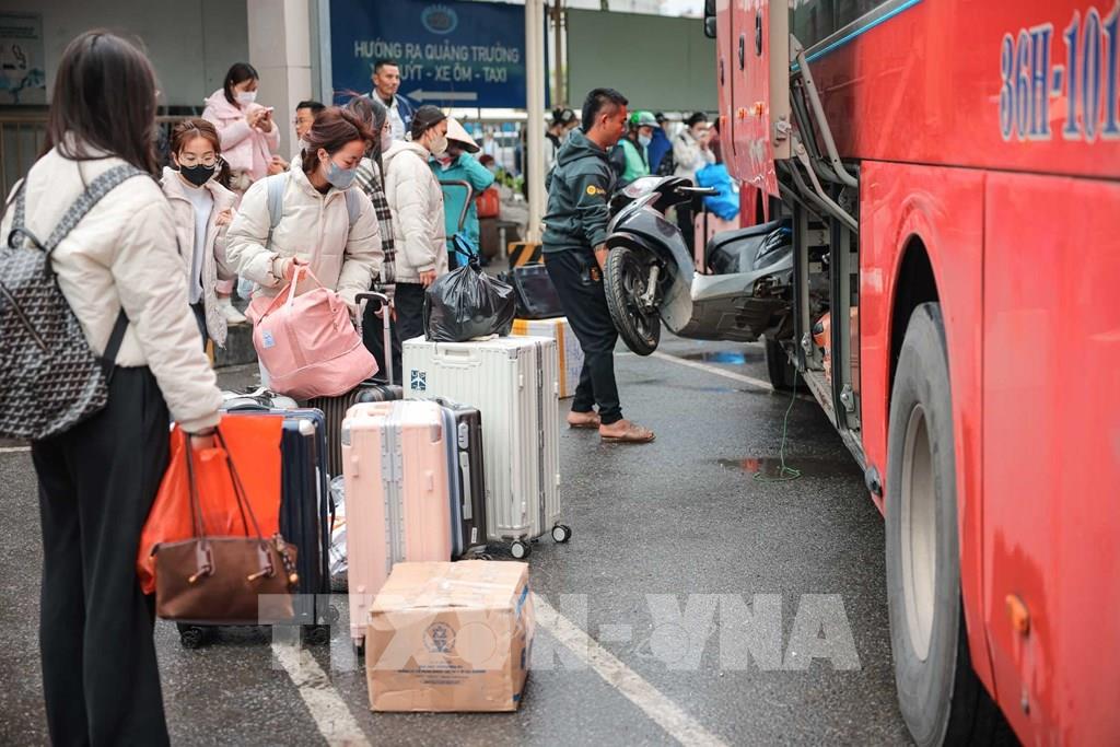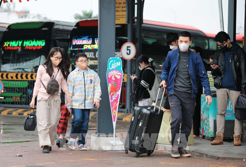 Hành khách từ các tỉnh phía Nam xuống xe tại Bến xe Nước Ngầm sau kỳ nghỉ Tết. Ảnh: Hoàng Hiếu - TTXVN