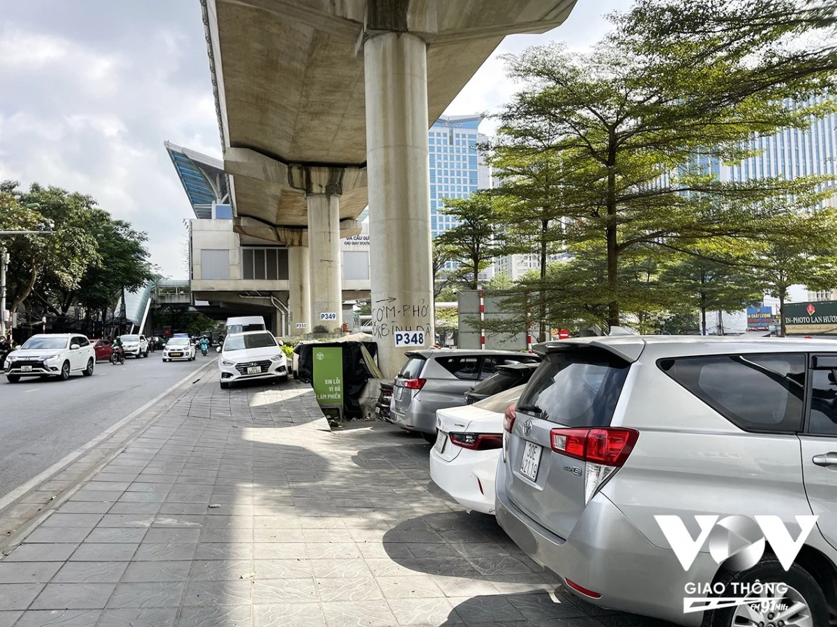 Thế nhưng, tại khu vực gầm nhà ga Cầu Giấy, tình trạng trông giữ xe trái phép vẫn diễn ra công khai. Dọc đường Kim Mã, đoạn cạnh đền Voi Phục, một bãi xe nằm ngay dưới tuyến đường sắt đô thị, chỉ cách mặt sàn nhà ga Cầu Giấy khoảng 5 mét. Toàn bộ vỉa hè khu vực này, kể cả lối tiếp cận điểm trung chuyển xe buýt, bị “bịt kín” bởi các phương tiện đỗ ngày đêm.