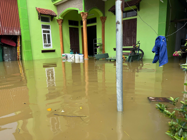 Nước lũ tràn qua đê bảo vệ gây ngập sâu cho khu dân cư. (Ảnh: VĂN THỊNH)