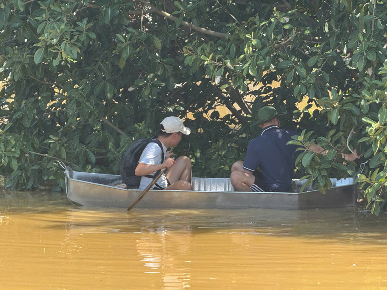 Người dân phải dùng thuyền để di chuyển vào khu vực ít ngập trong để lấy thực phẩm, tắm rửa nhờ nhà người thân. (Ảnh: VĂN THỊNH)