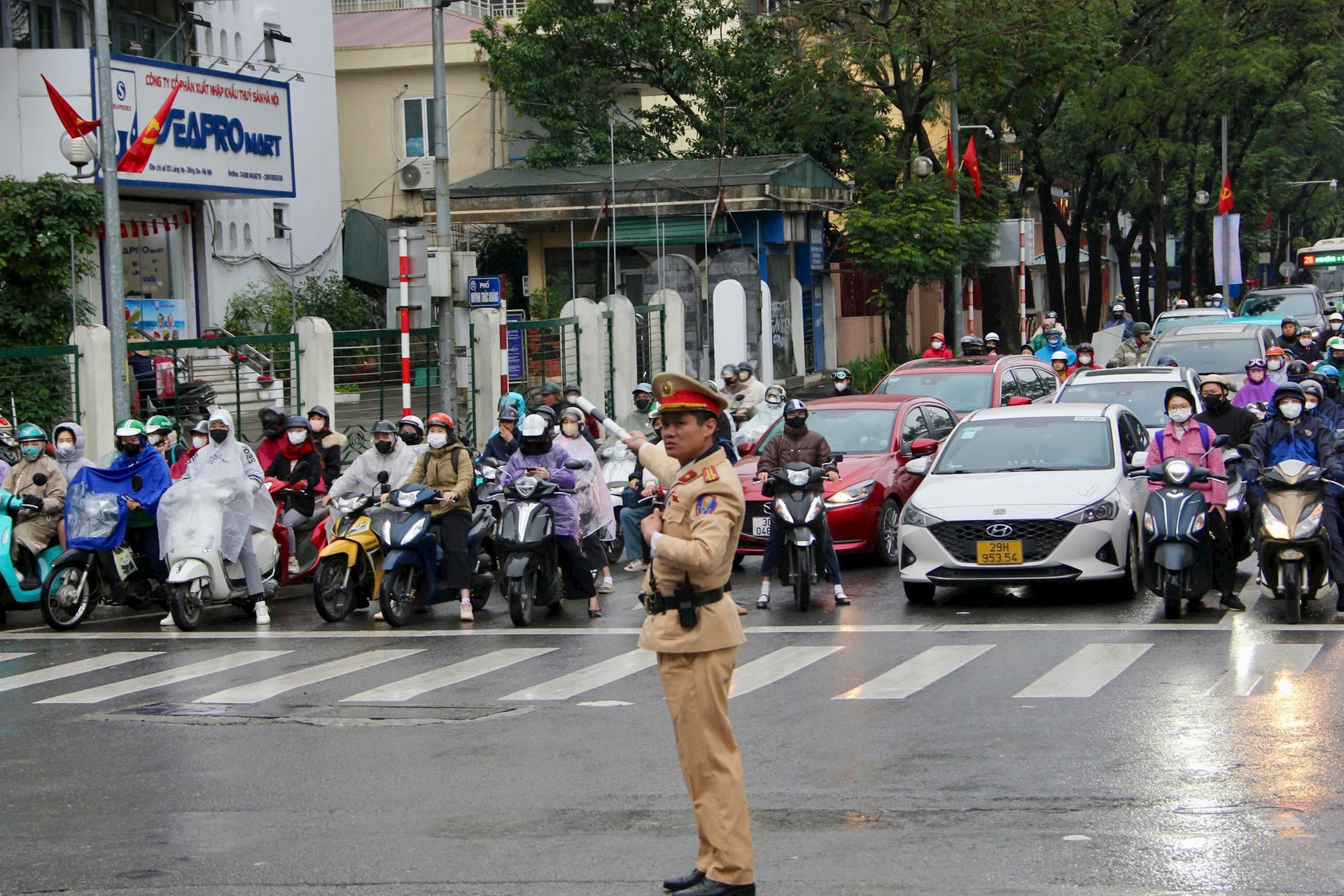 Trên trục Láng - Trường Chinh, Nguyễn Trãi - Khuất Duy Tiến, mật độ phương tiện dày đặc, mưa kéo dài trong suốt giờ cao điểm khiến việc lưu thông gặp nhiều khó khăn, đòi hỏi sự phối hợp nhịp nhàng giữa các đội cảnh sát giao thông trên tuyến để bảo đảm giao thông thông suốt.