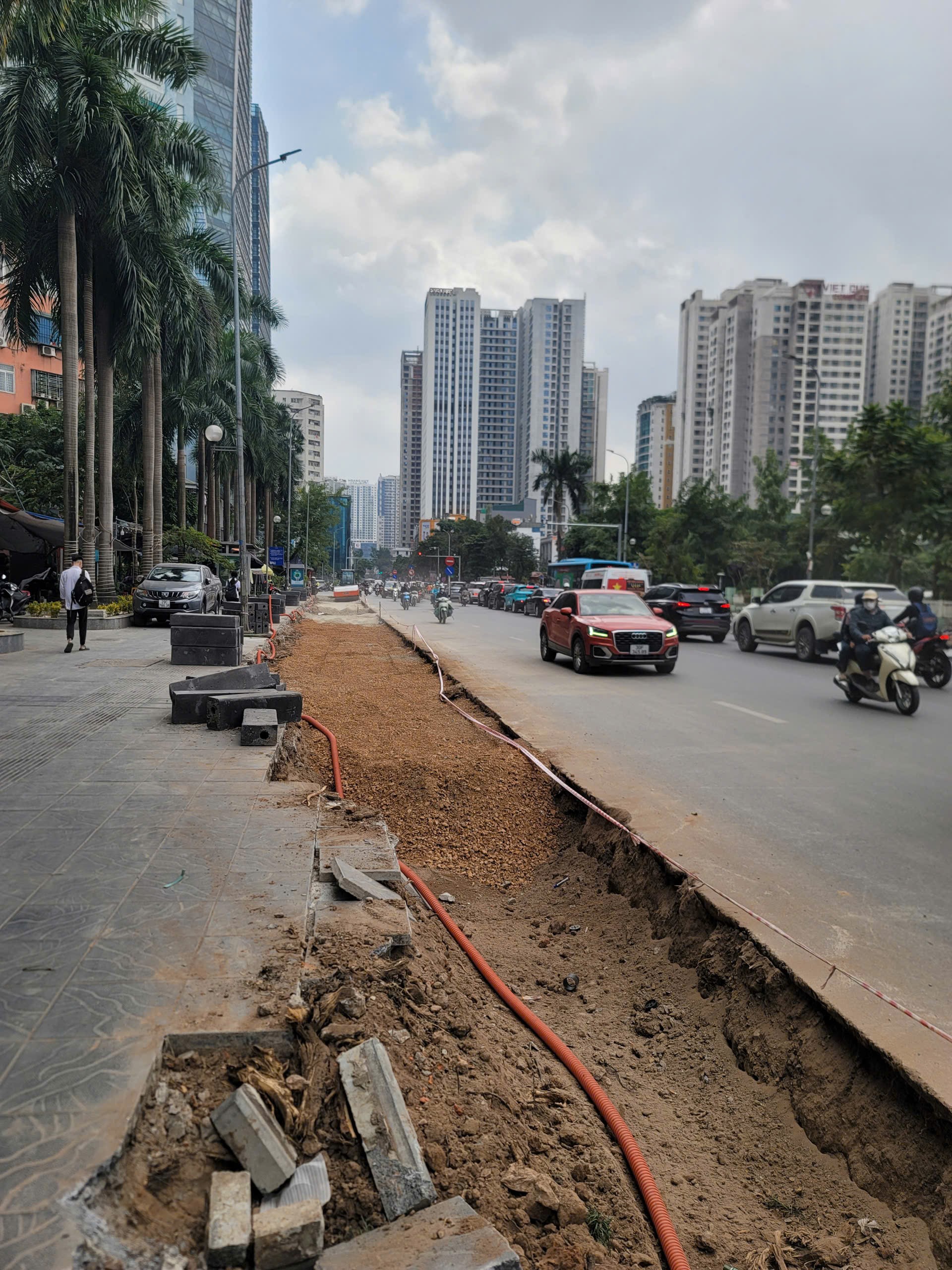 Vỉa hè đối diện công viên Thanh Xuân được thu nhỏ lại để mở rộng lòng đường nhằm giảm ùn tắc. Ảnh: QUỐC KHÁNH