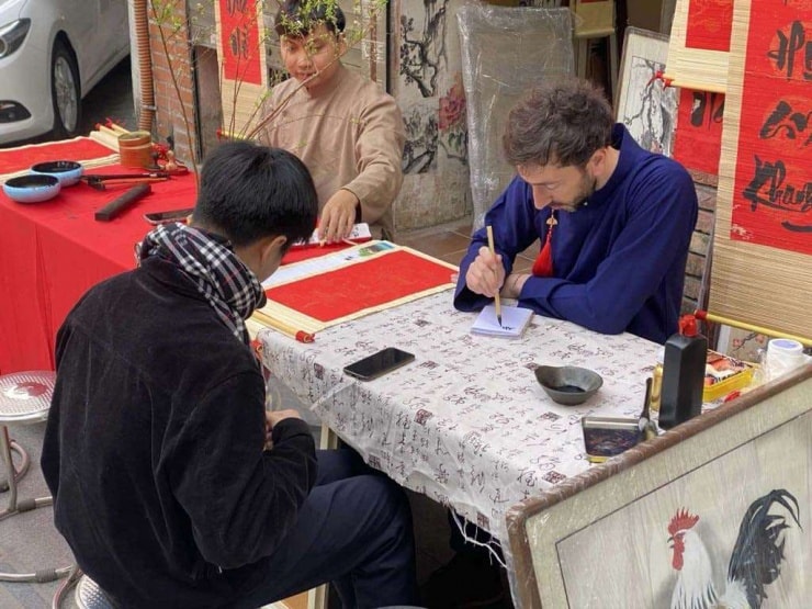 Du khách học viết chữ Nho tại Văn Miếu Quốc Tử Giám năm 2025. (Ảnh: Huy Hoàng)