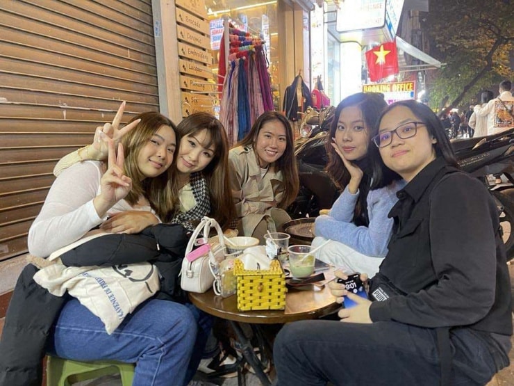 Nhóm du khách Nhật Bản thưởng thức trà tại phố cổ Hà Nội, chờ đón giao thừa 2025. (Ảnh: Huy Hoàng)