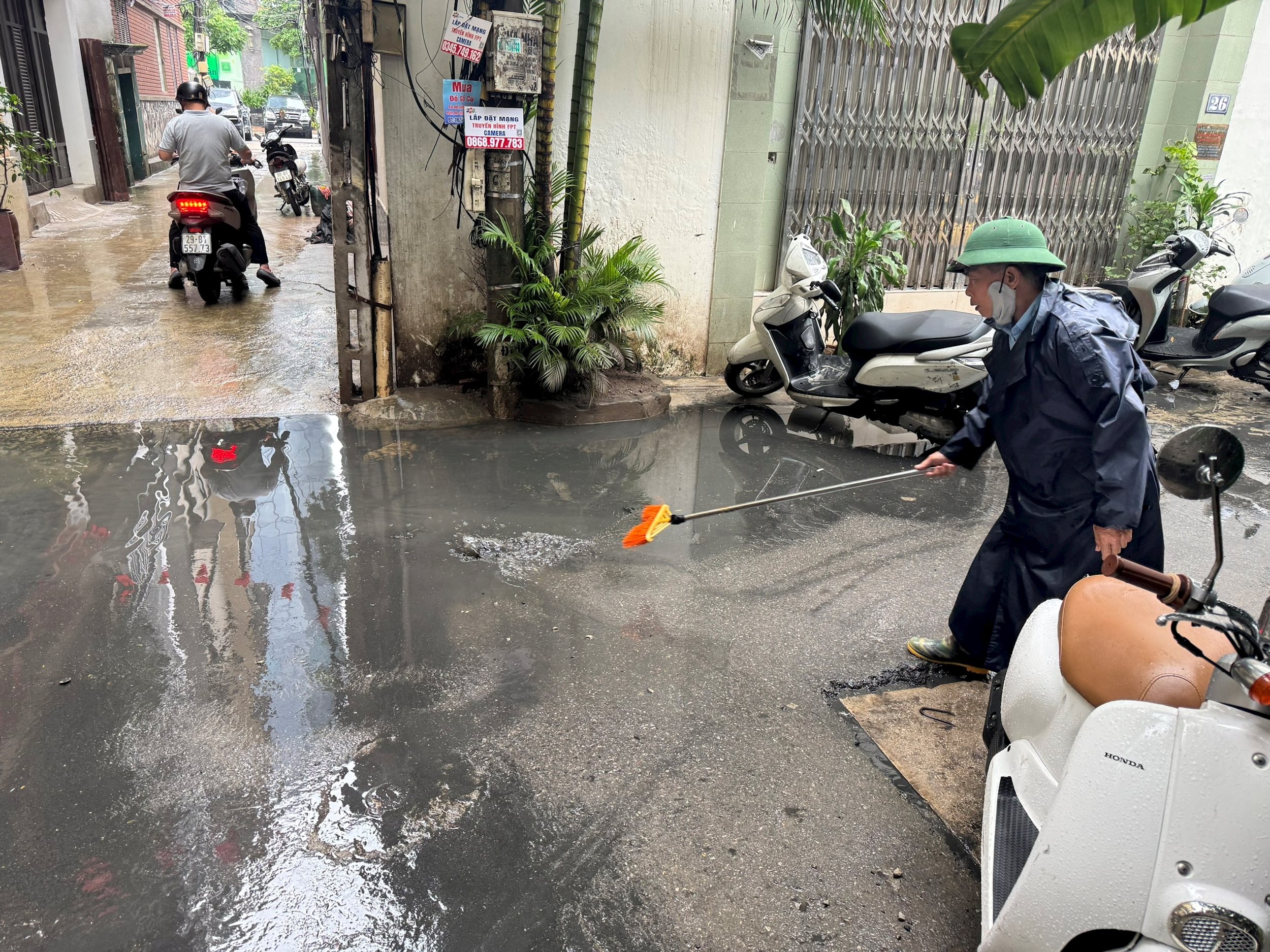 Người dân quét dọn sau cơn mưa