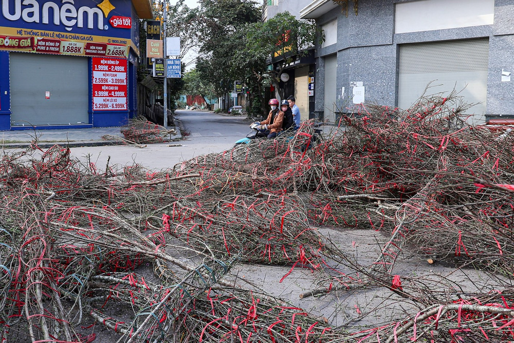 Những "núi" cành đào bị vứt bỏ chất đống trước các cửa hàng đã đóng cửa nghỉ Tết. Đây là hình ảnh ám ảnh nhất trong chiều 30 Tết đối với những người mưu sinh bằng nghề hoa cây cảnh.