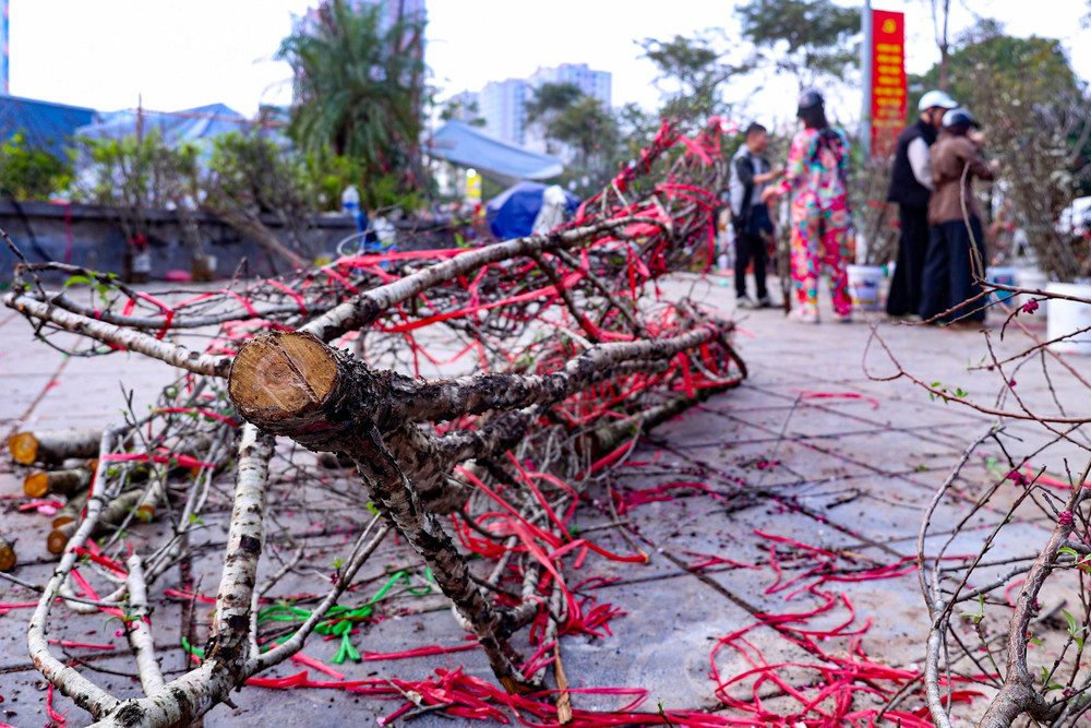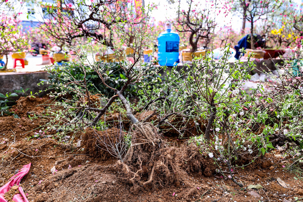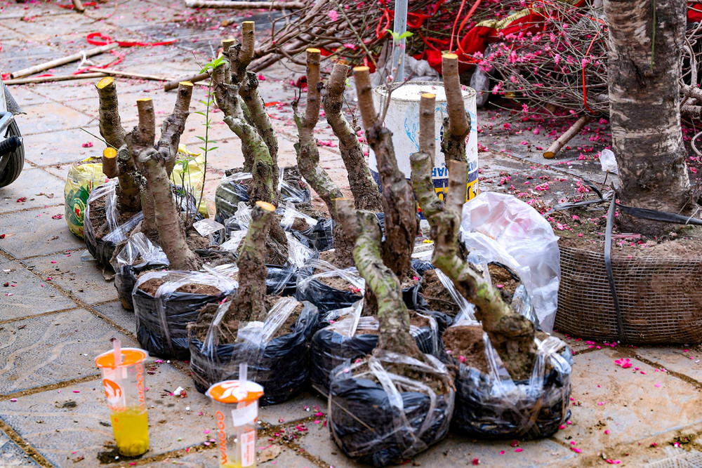 Những gốc đào phai bị nhổ bật rễ, vứt bỏ ngay tại điểm bán. Đất cát vương vãi, rễ cây phơi trắng tạo nên khung cảnh tiêu điều trái ngược với sự rực rỡ thường thấy của đường hoa.