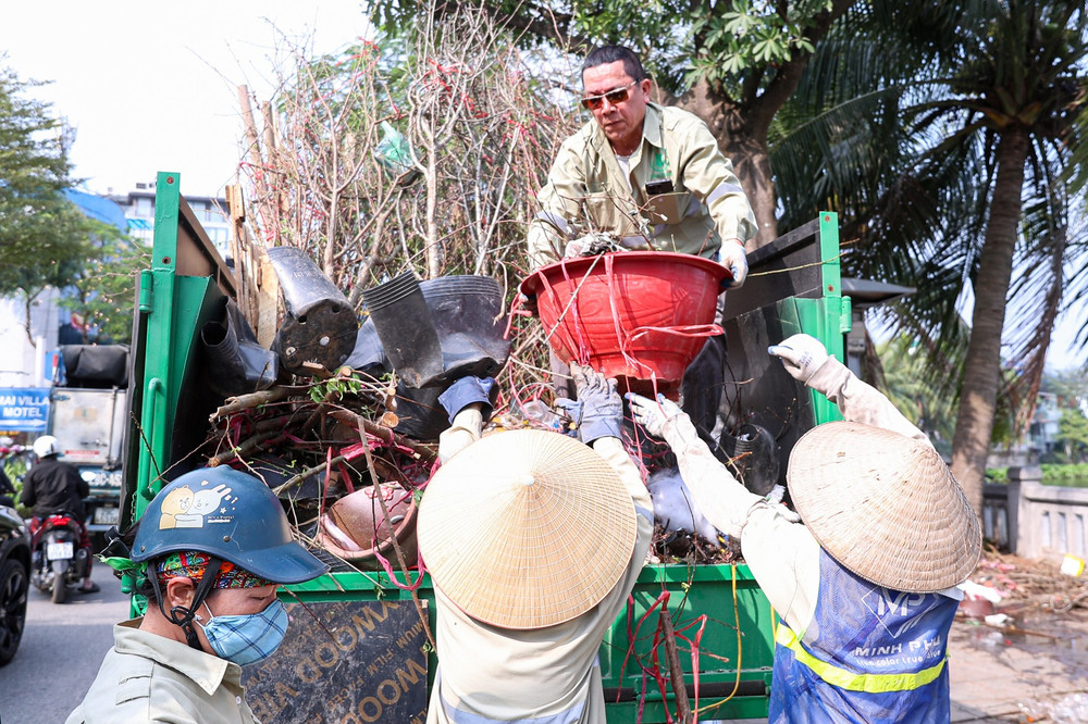 Xe rác chất đầy xác hoa, chậu cảnh. Những chậu hoa từng được kỳ vọng mang lại sắc xuân cho mọi nhà nay kết thúc vòng đời trên thùng xe thu gom rác.