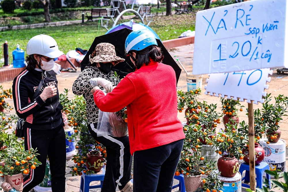 Quất cảnh cũng chịu chung số phận với mức đồng giá 200.000 đồng. Những chậu cây trĩu quả, vàng ươm giờ đây được bày bán như rau, như cỏ giữa chiều cuối năm.