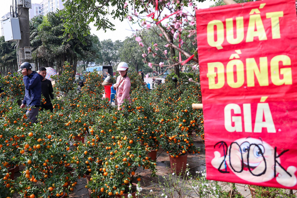 Những tấm biển "Xả rẻ sập vườn", "120k/cây" xuất hiện dày đặc ở nhiều điểm chợ hoa xuân. Đây là mức giá thấp kỷ lục, chỉ bằng một phần nhỏ so với công sức chăm sóc cả năm của người làm vườn.