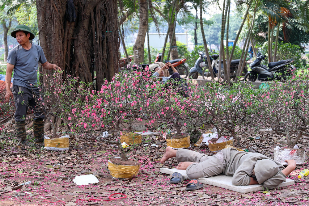 Sự kiệt sức hiện rõ trên dáng nằm của người tiểu thương. Sau nhiều đêm thức trắng canh hàng dưới sương lạnh, giờ đây anh tranh thủ chợp mắt ngay trên vỉa hè, bên cạnh những gốc đào ế ẩm chưa biết đi đâu về đâu.