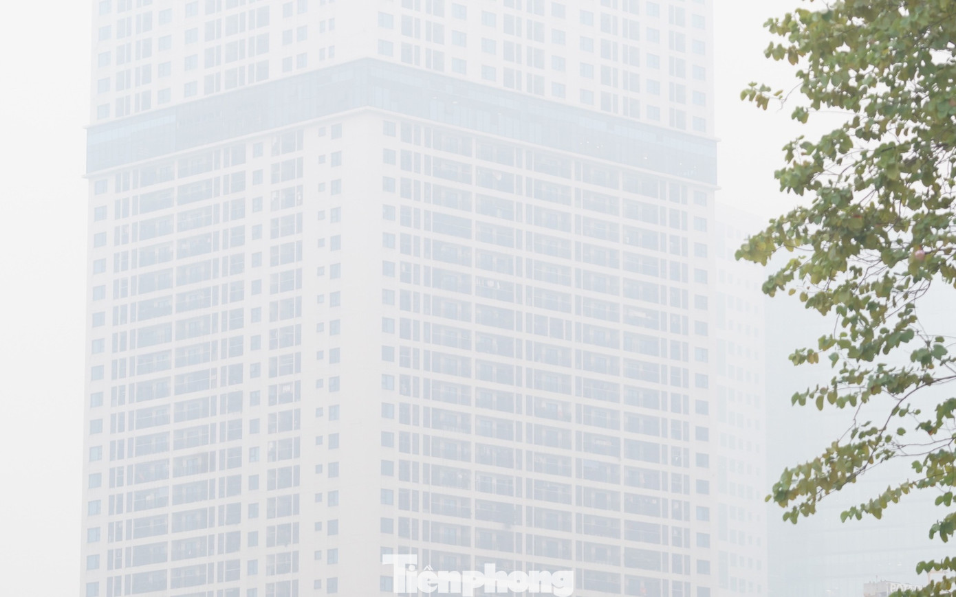 Nhìn từ trên cao, toàn bộ khu vực phường Cầu Giấy gần như biến mất trong lớp khói mù trắng đục dày đặc, chỉ còn lờ mờ bóng dáng các tòa chung cư.