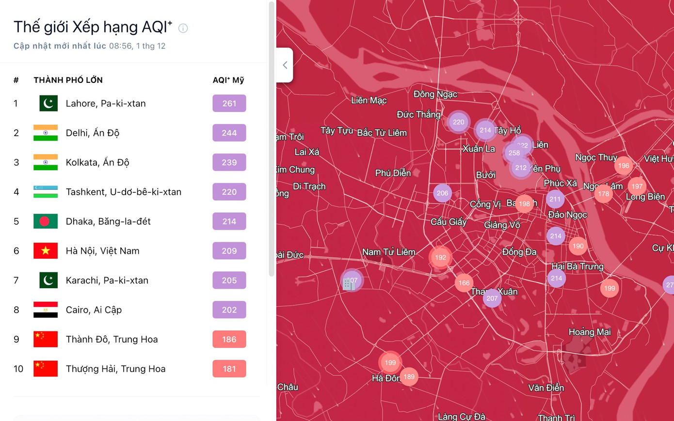 Theo ghi nhận của ứng dụng AirVisual sáng nay, Hà Nội đã vọt lên vị trí thứ 6 trong danh sách các thành phố ô nhiễm nhất thế giới. Chỉ số chất lượng không khí (AQI) vượt ngưỡng 200 (ngưỡng Tím), cảnh báo mức độ rất có hại cho sức khỏe cộng đồng.