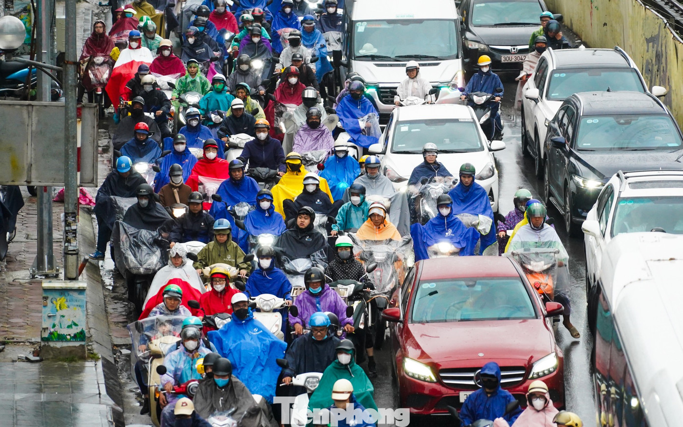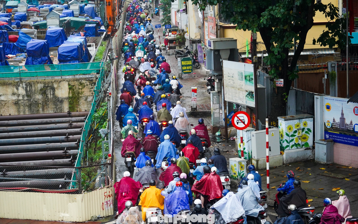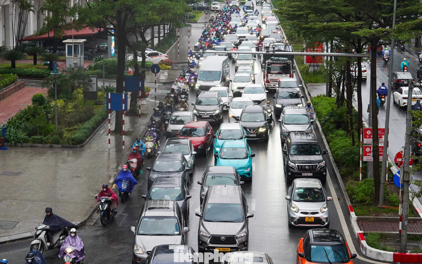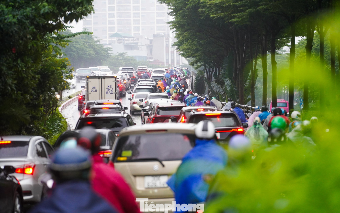 Vành đai 2.5 ùn tắc khiến dòng xe dồn sang đường Bưởi, giao thông chỉ nhích từng chút một trong mưa.