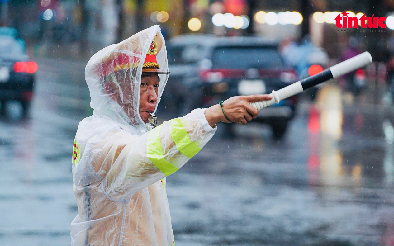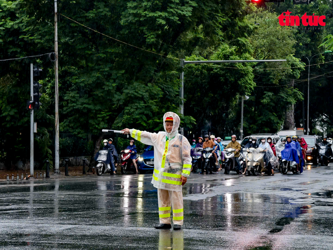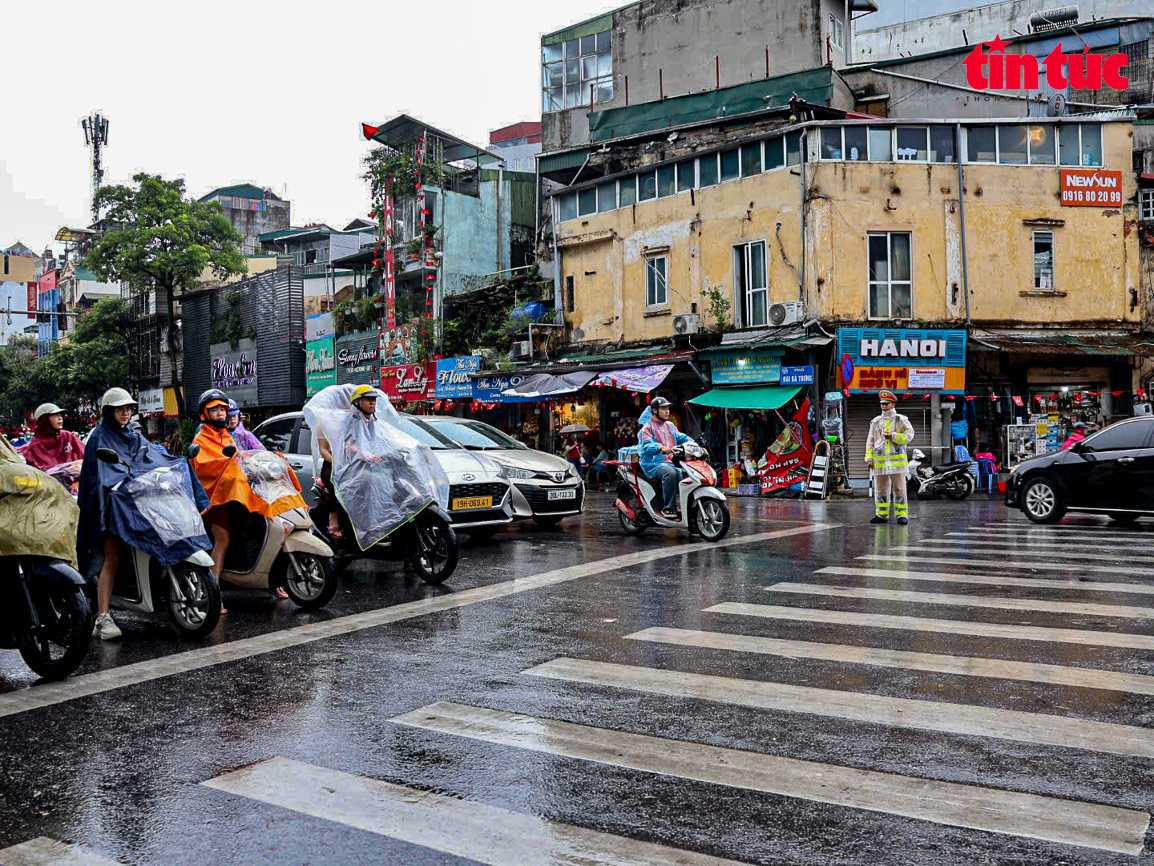 Ảnh hưởng của bão số 11 gây mưa trên diện rộng ở Hà Nội trong bối cảnh lưu lượng phương tiện tham gia giao thông tăng cao, đặc biệt vào giờ cao điểm.
