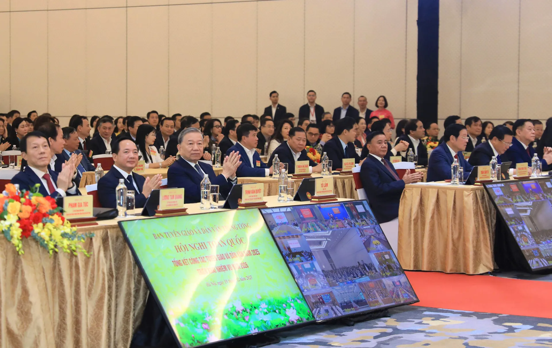 Tổng Bí thư Tô Lâm và các đại biểu dự Hội nghị toàn quốc tổng kết công tác tuyên giáo và dân vận năm 2025, triển khai nhiệm vụ năm 2026. Ảnh: Quang Thái