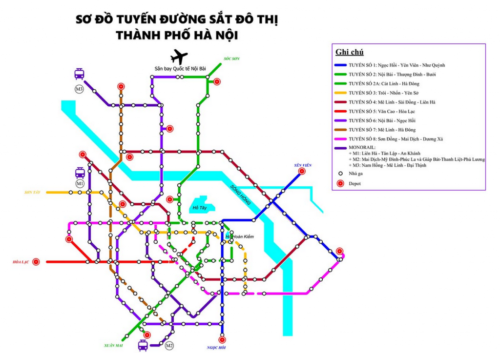 Sơ đồ các tuyến đường sắt đô thị của Hà Nội được hình thành trong thời gian tới.