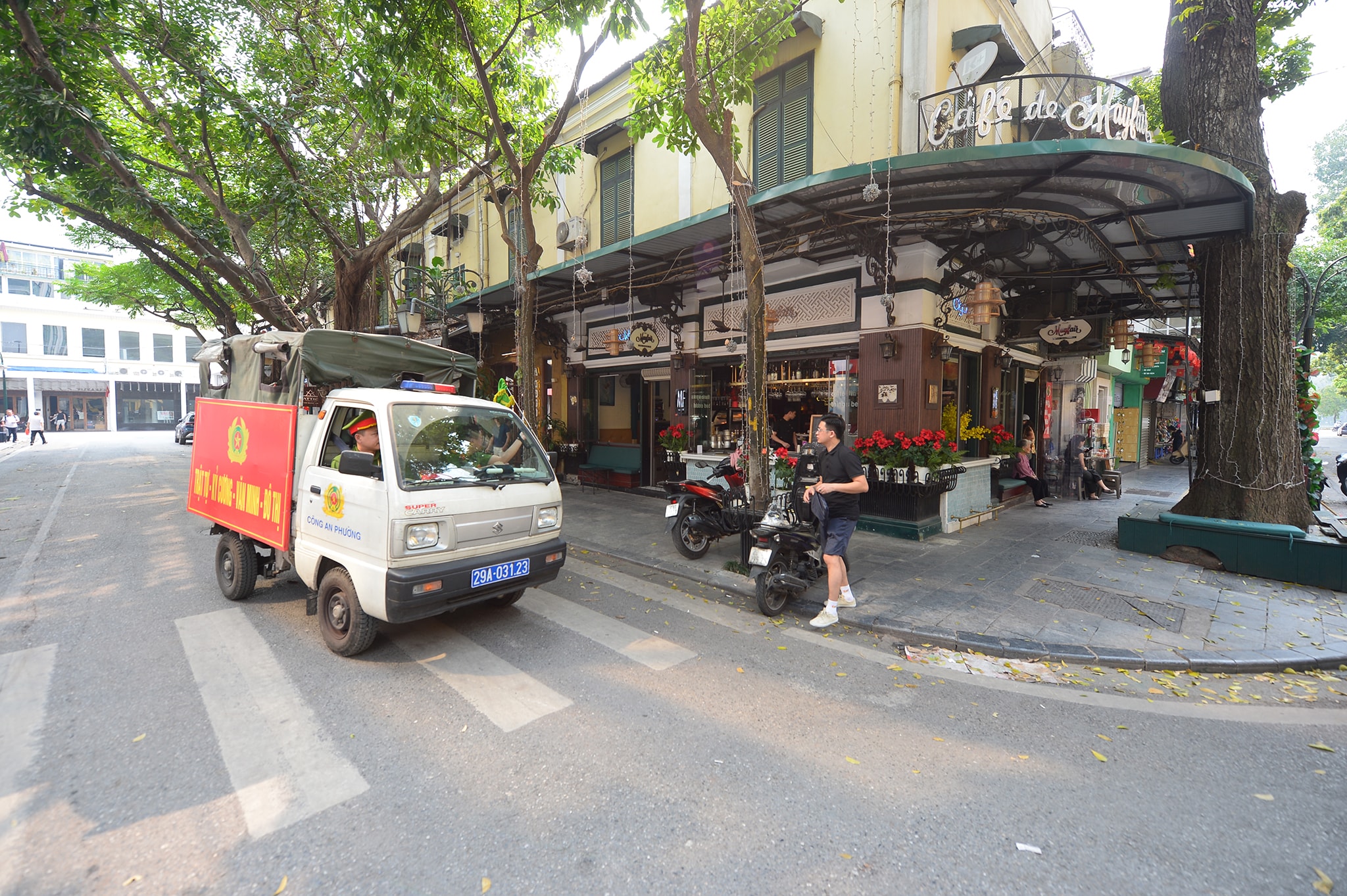Cán bộ Công an phường Hoàn Kiếm phát loa thông báo nhắc nhở các hộ kinh doanh trên địa bàn phường