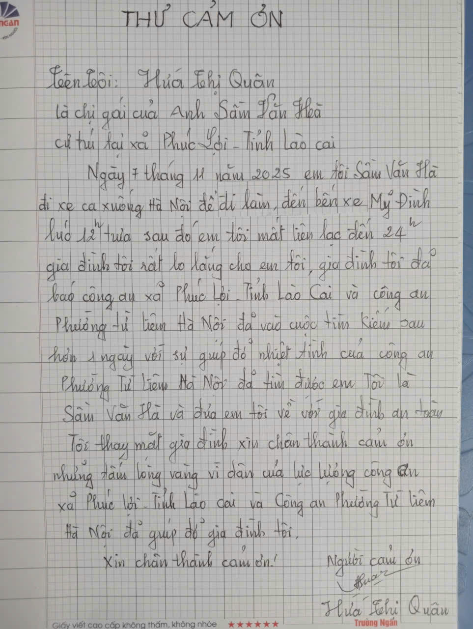 Gia đình gửi lời cảm ơn chân thành đến lực lượng công an đã hỗ trợ tìm người thất lạc