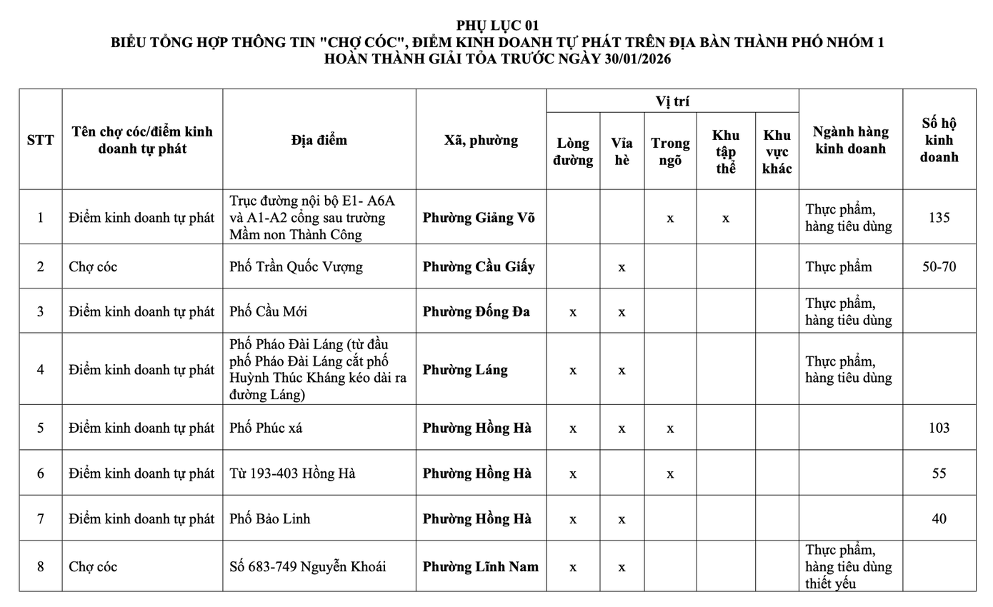 Nhóm 3, gồm các điểm có từ 50 đến 100 hộ kinh doanh, phải hoàn thành giải tỏa trước ngày 30/12/2026.