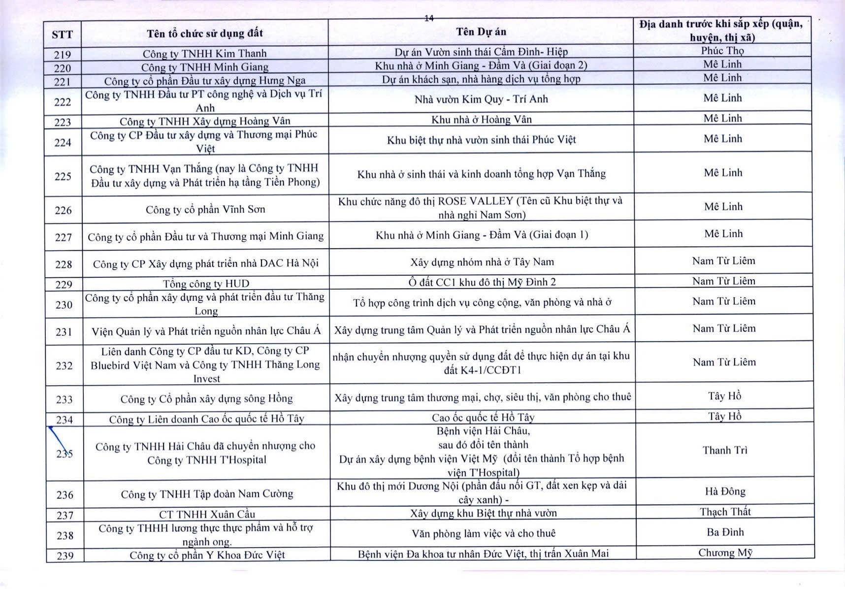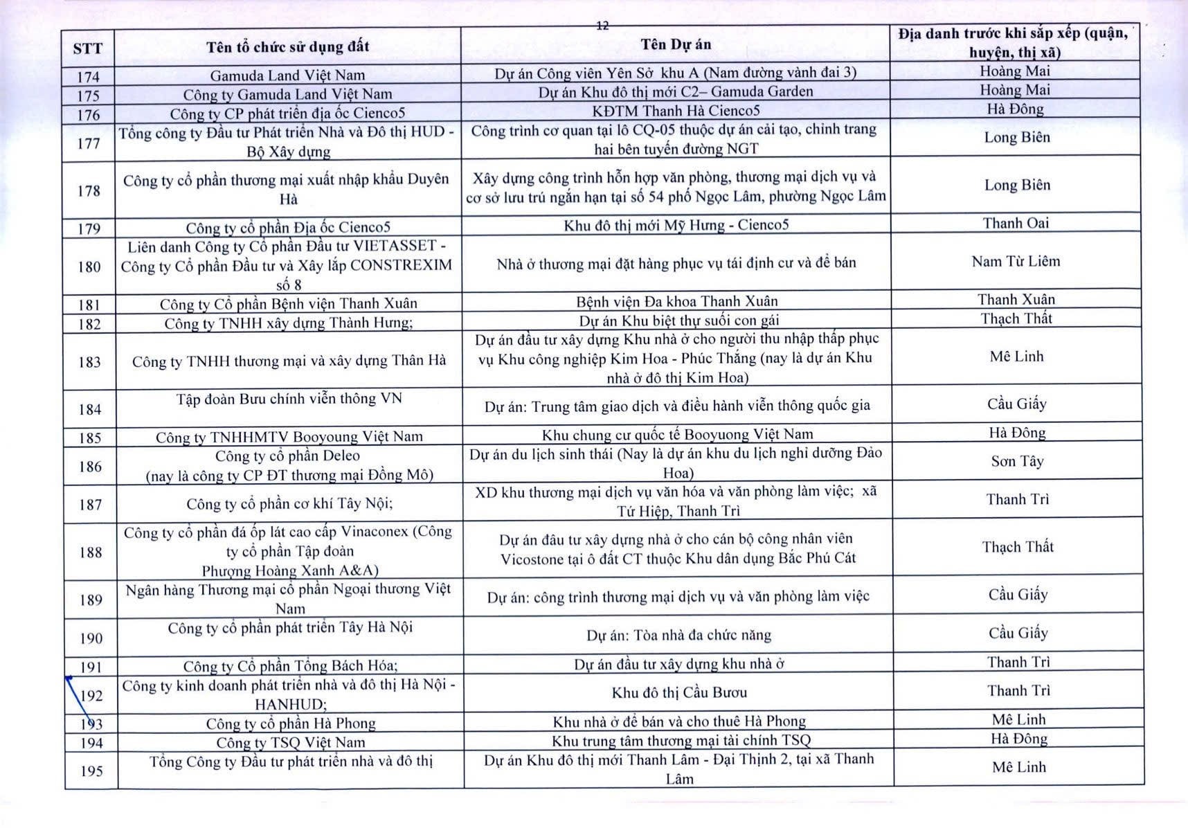 Dưới đây là danh sách 341 dự án vốn ngoài ngân sách có sử dụng đất chậm triển khai trên địa bàn thành phố Hà Nội: