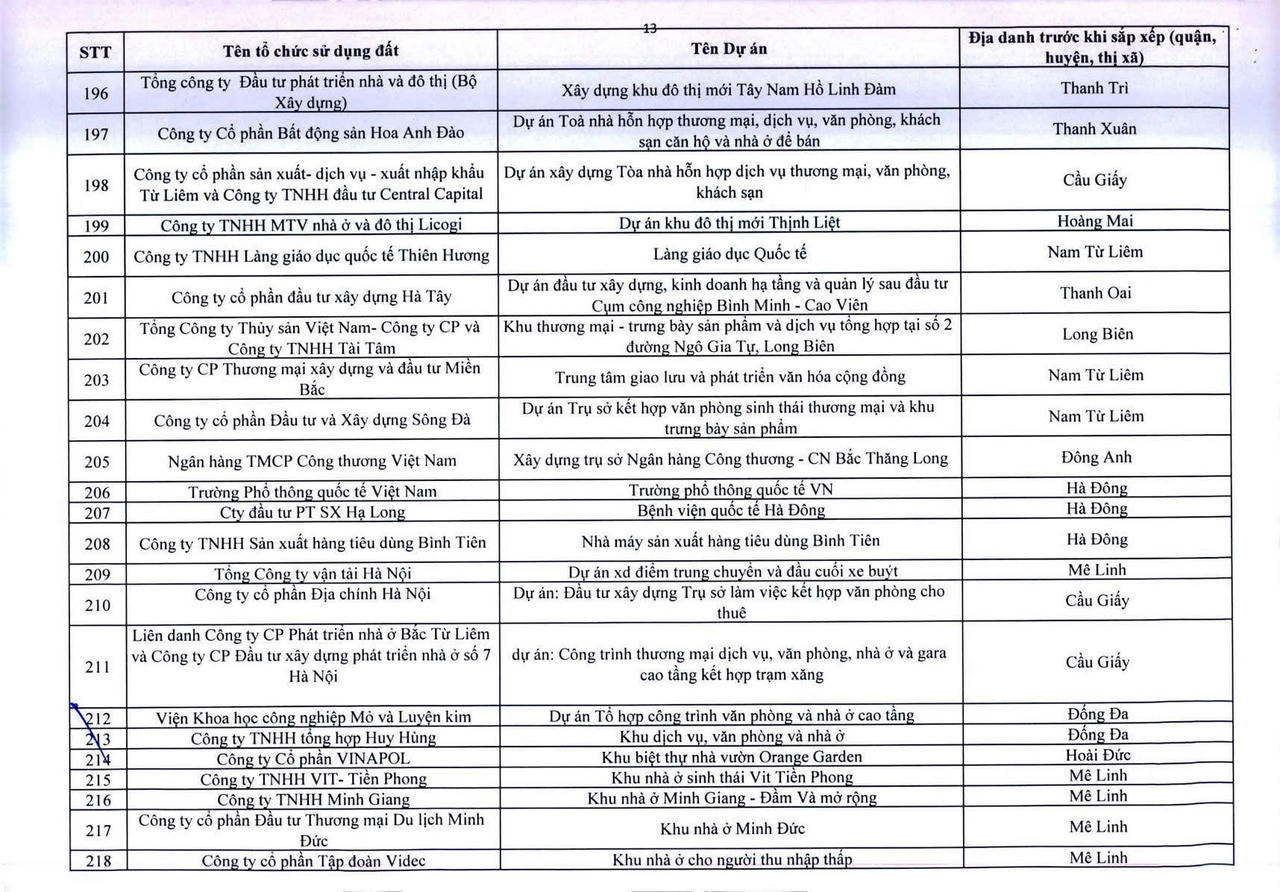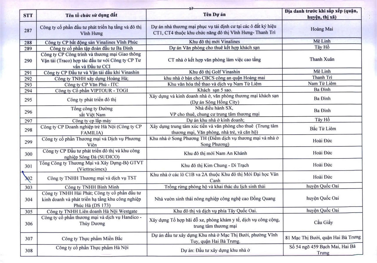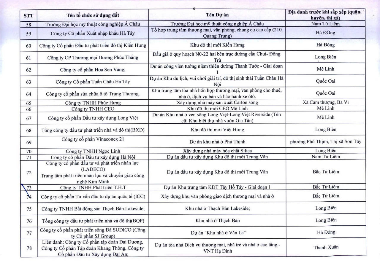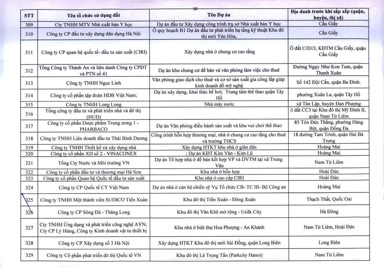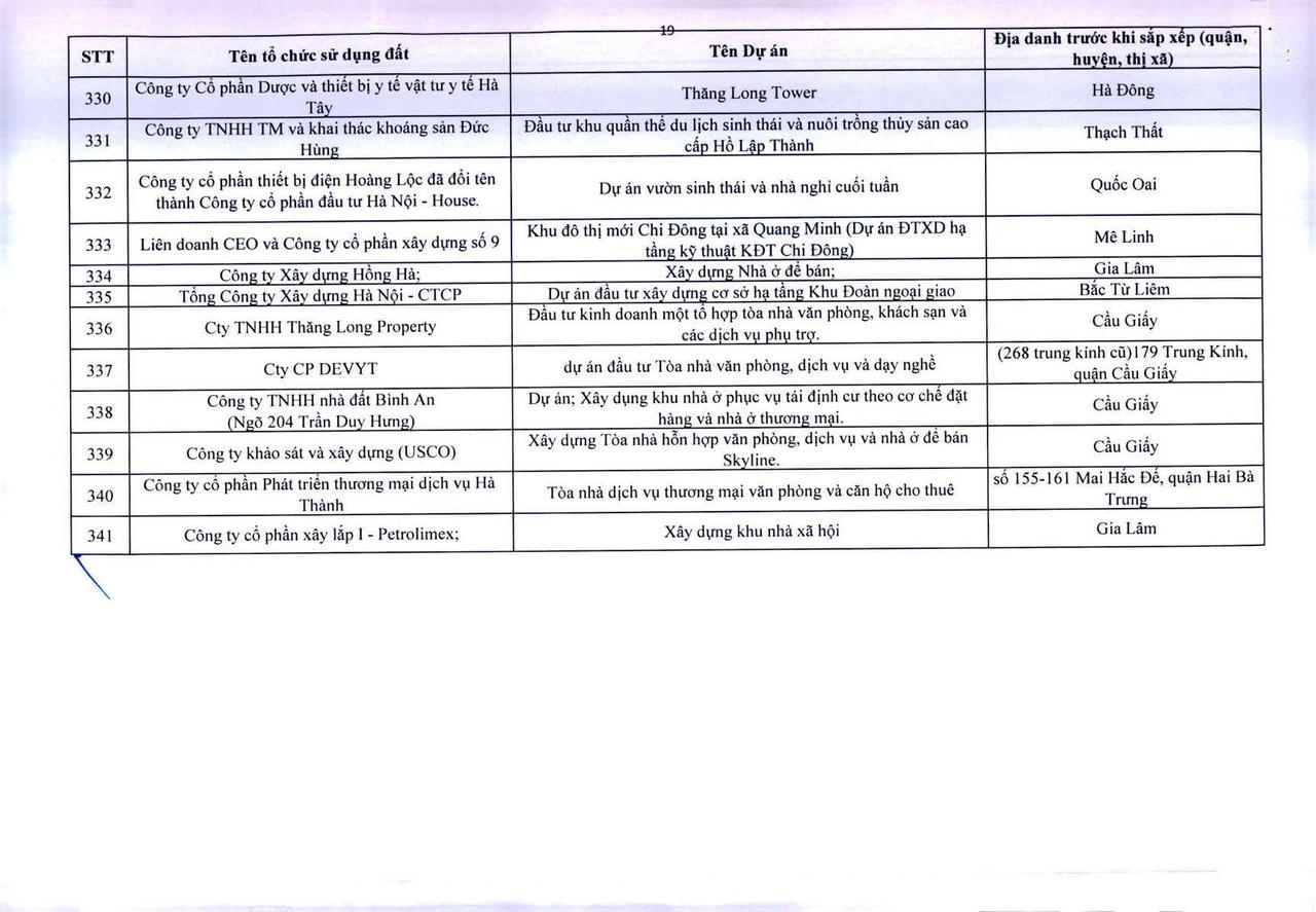 Dưới đây là danh sách 341 dự án vốn ngoài ngân sách có sử dụng đất chậm triển khai trên địa bàn thành phố Hà Nội:
