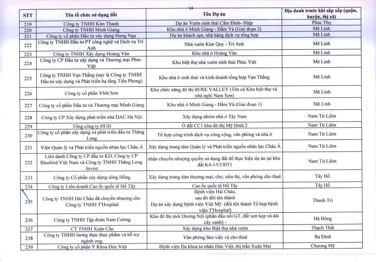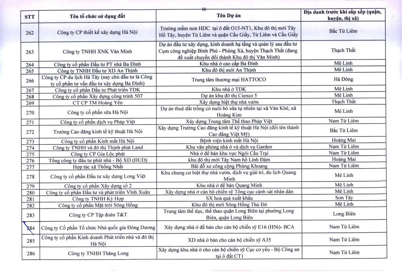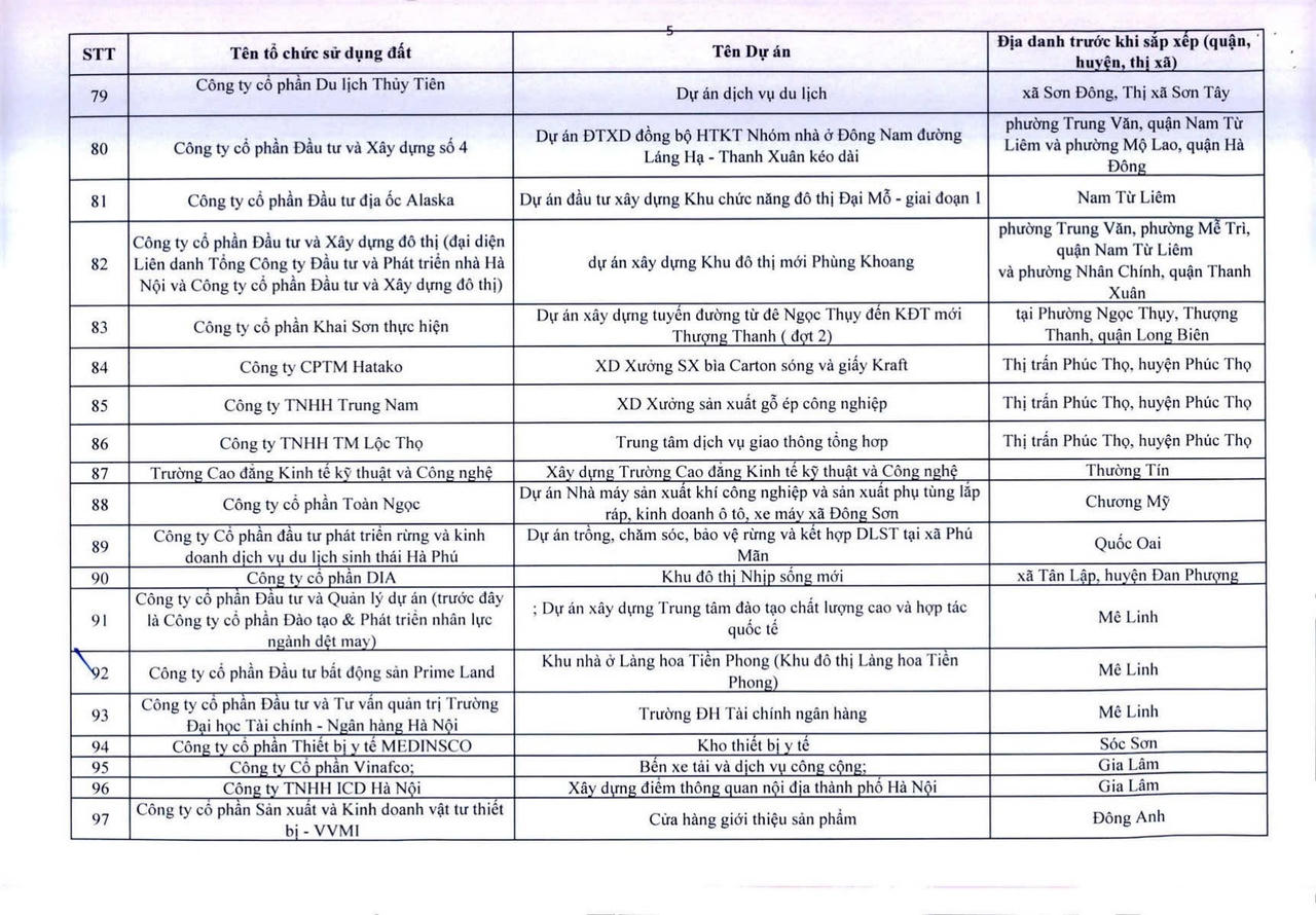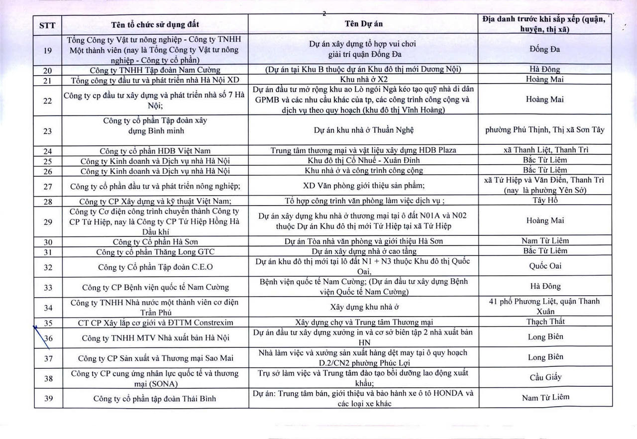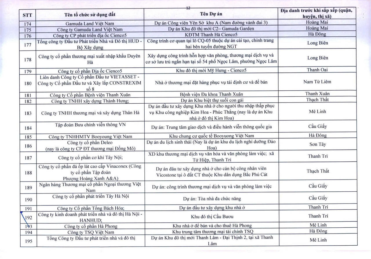 Dưới đây là danh sách 341 dự án vốn ngoài ngân sách có sử dụng đất chậm triển khai trên địa bàn thành phố Hà Nội: