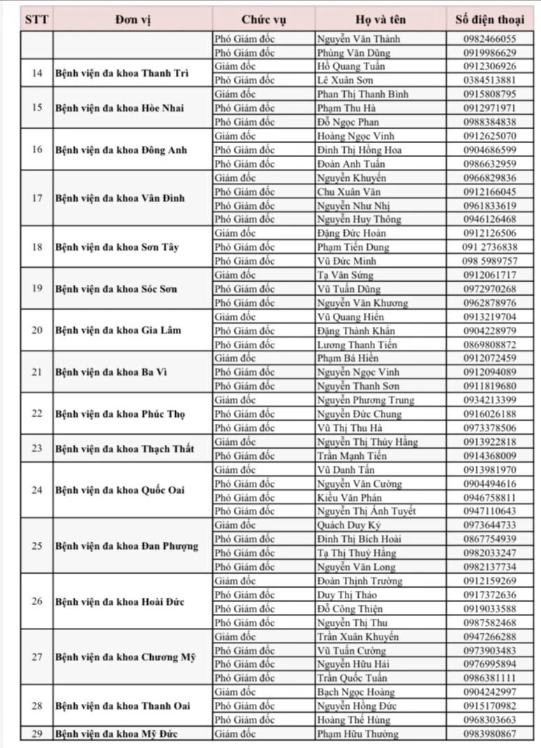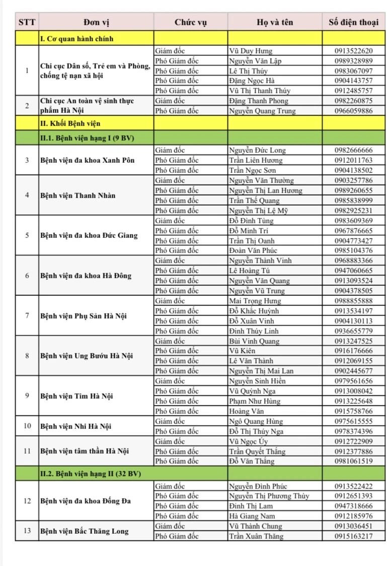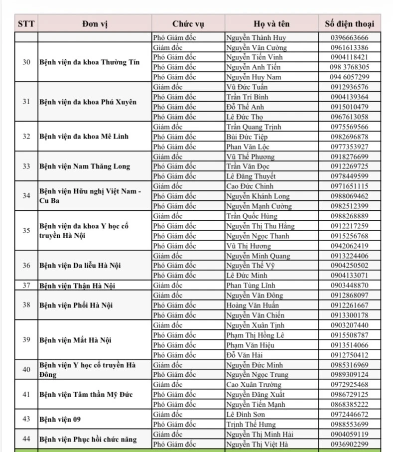 Danh sách số điện thoại đường dây nóng của thủ trưởng các đơn vị trực thuộc Sở Y tế Hà Nội. Nguồn: SYT Hà Nội