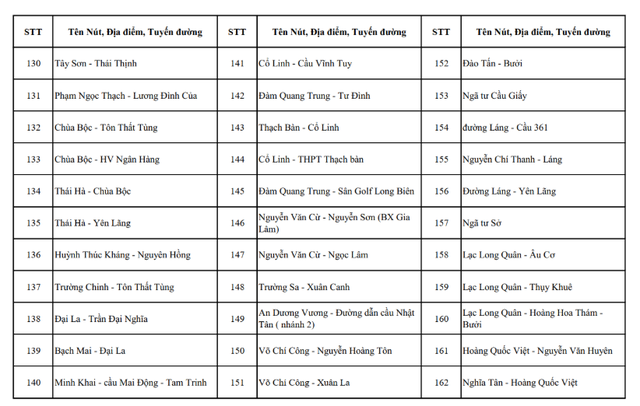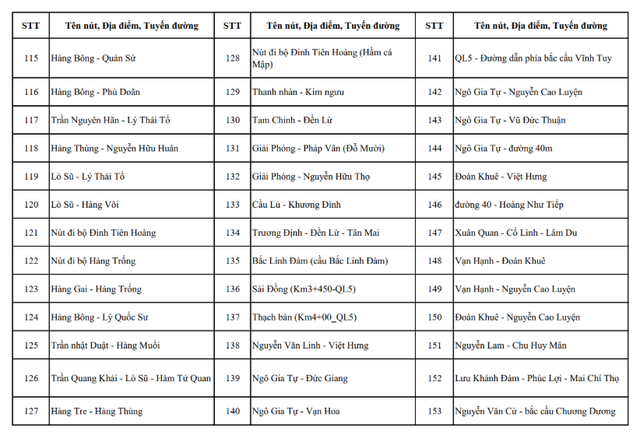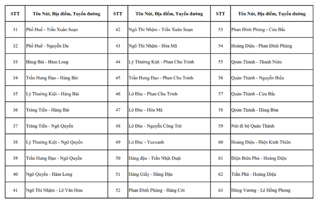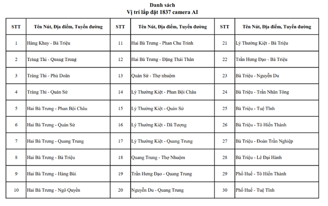 Công an thành phố Hà Nội thông báo các vị trí lắp đặt camera AI phục vụ xử lý vi phạm trong lĩnh vực trật tự, an toàn giao thông, trật tự đô thị, trật tự công cộng.