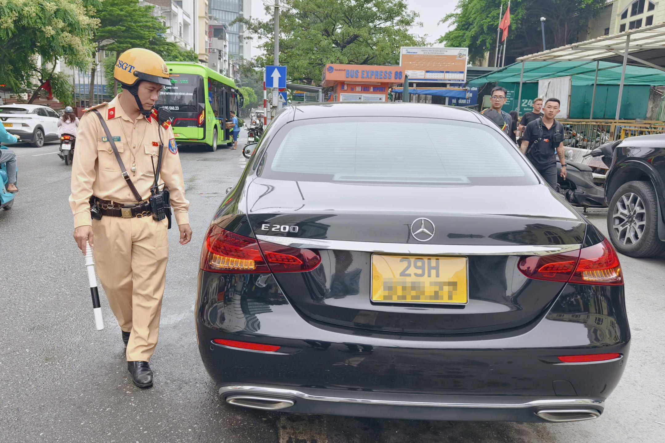 Tại đoạn đường đang thi công trước ga Hà Nội (đường Lê Duẩn), CSGT phát hiện nhiều tài xế dừng đỗ xe sau biển cấm. Như trường hợp chiếc Mercedes (trong ảnh) bị tổ tuần tra ghi nhận dừng phương tiện sai quy định ngay gần công trình.