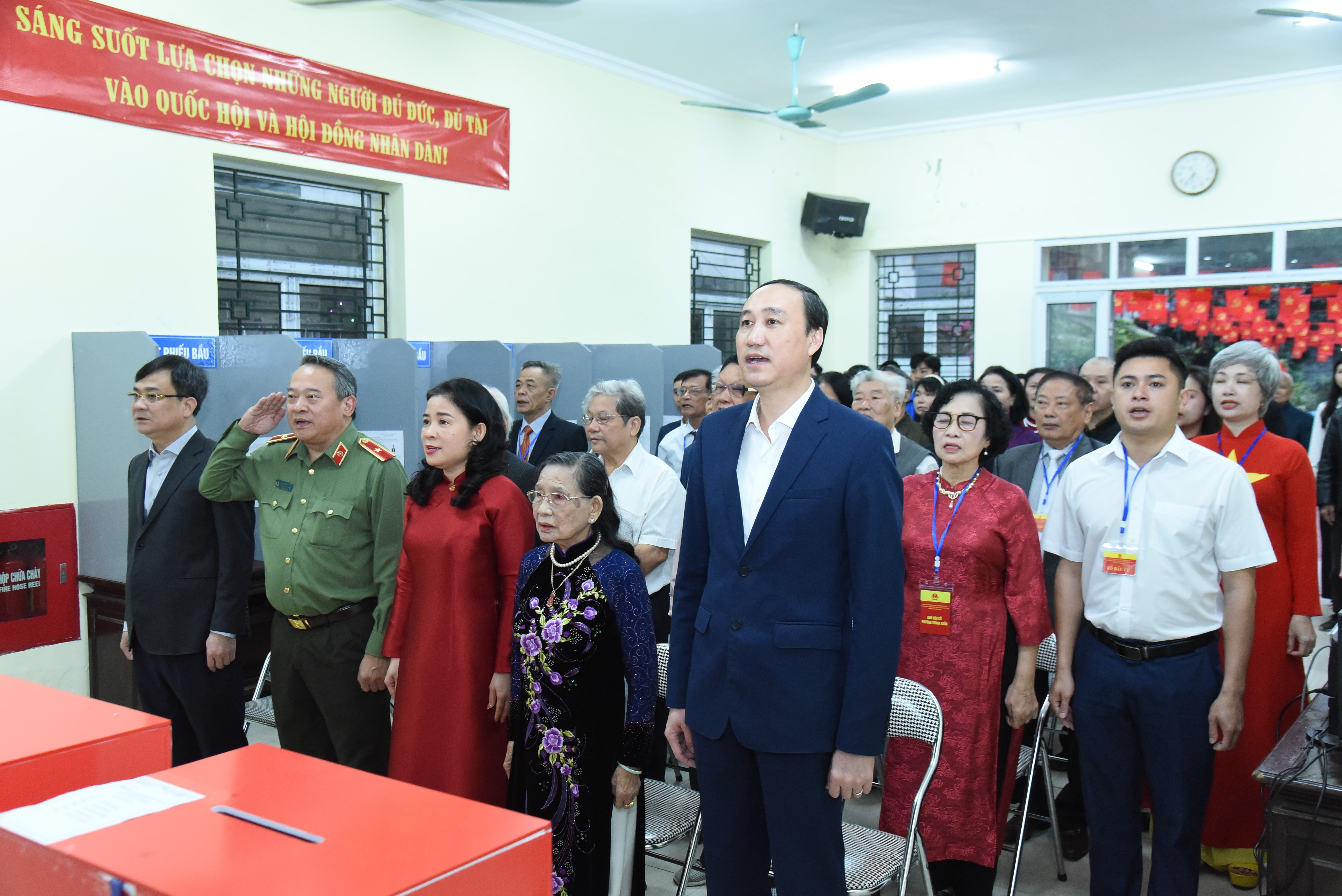 Các đại biểu và cử tri thực hiện nghi thức chào cờ. Ảnh: Xuân Quý