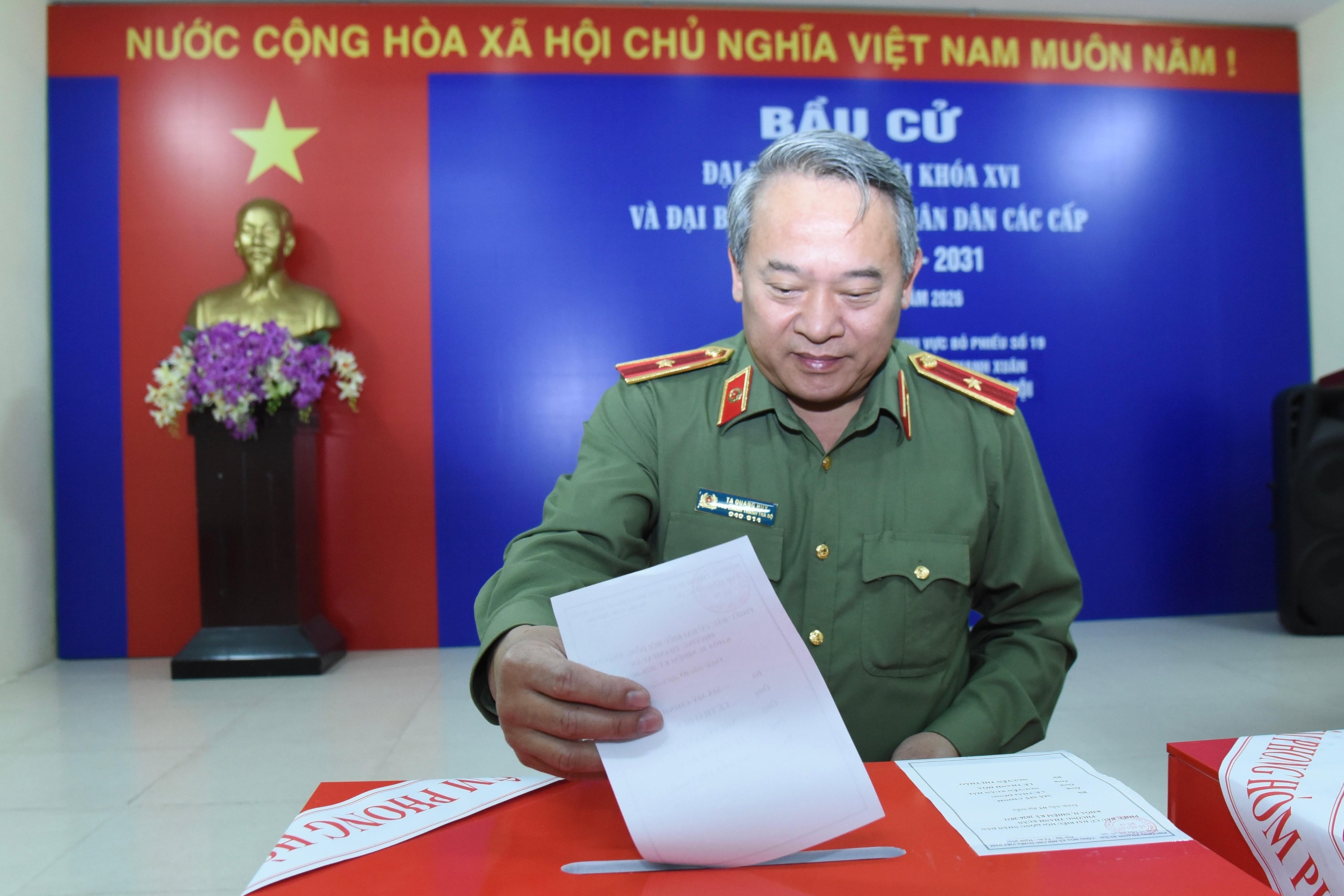 Phó Chánh Thanh tra Bộ Công an, Thiếu tướng Tạ Quang Huy thực hiện quyền bầu cử tại Khu vực bỏ phiếu số 19. Ảnh: Xuân Quý