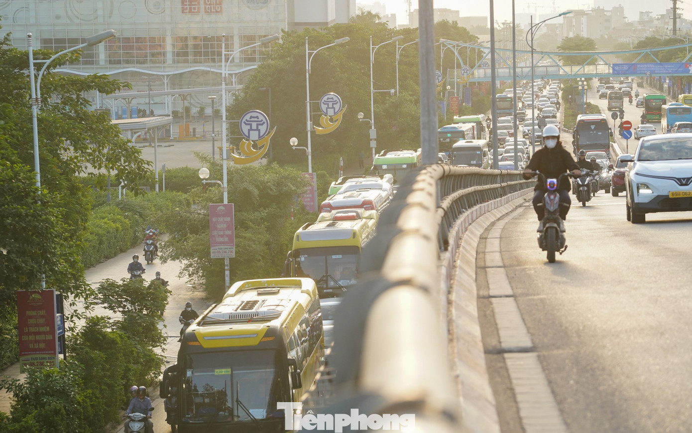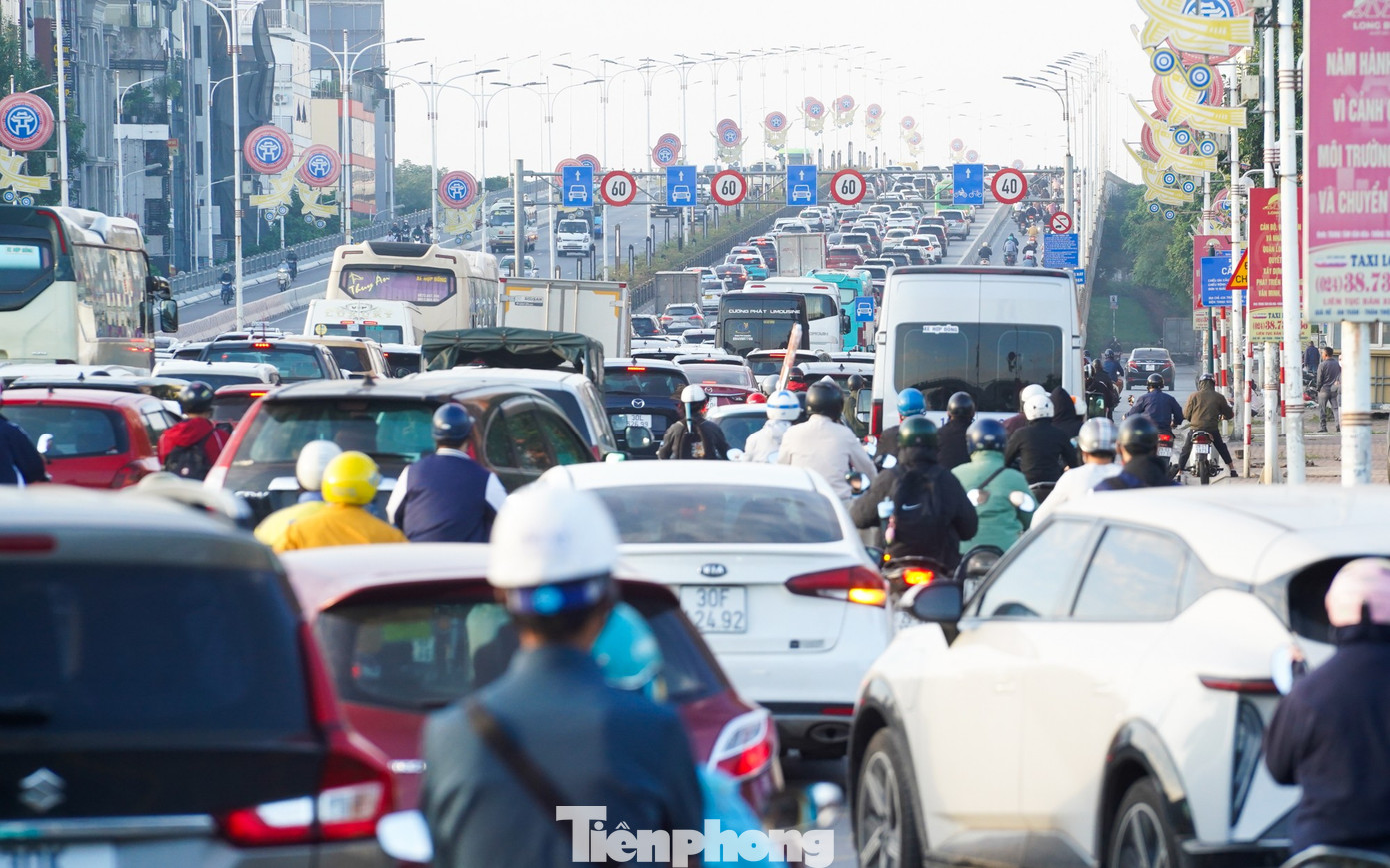 Dòng xe ken đặc, di chuyển chậm chạp theo hướng cầu Vĩnh Tuy vào khu vực trung tâm Hà Nội.