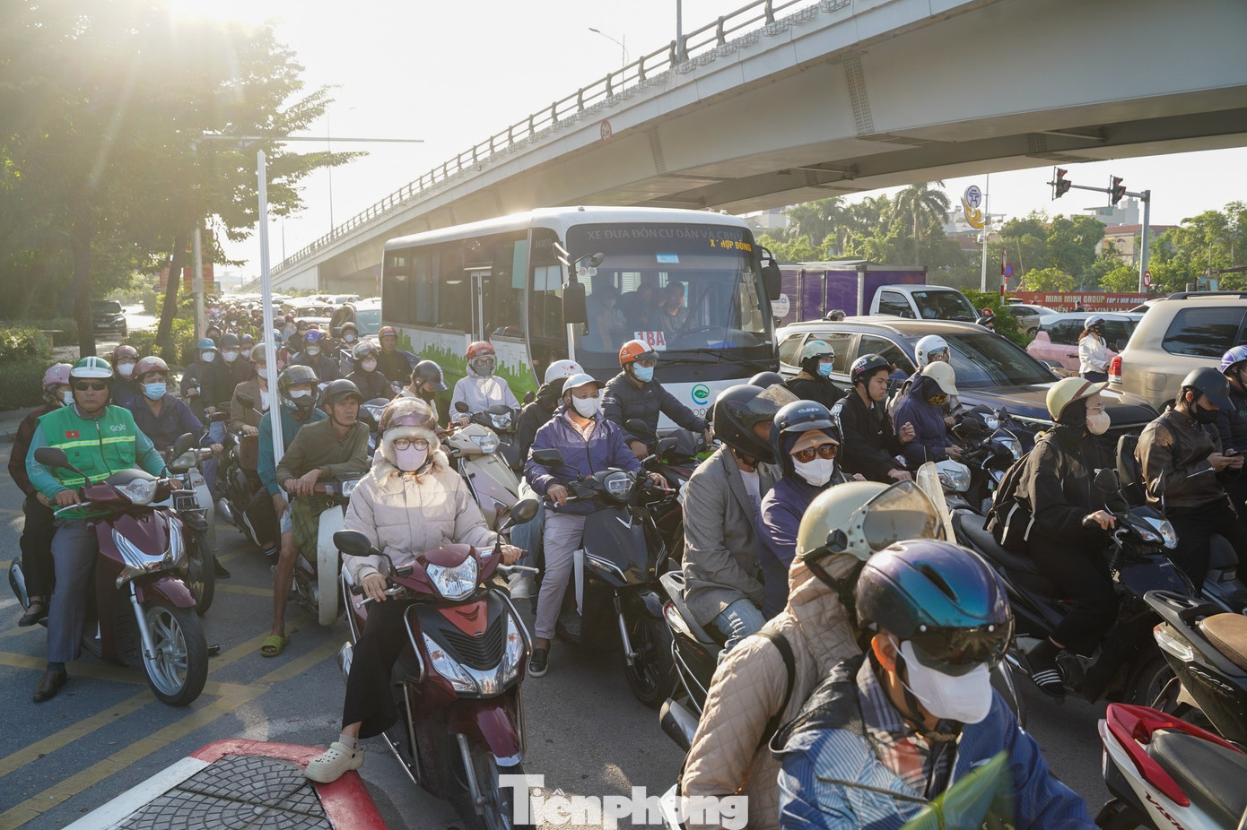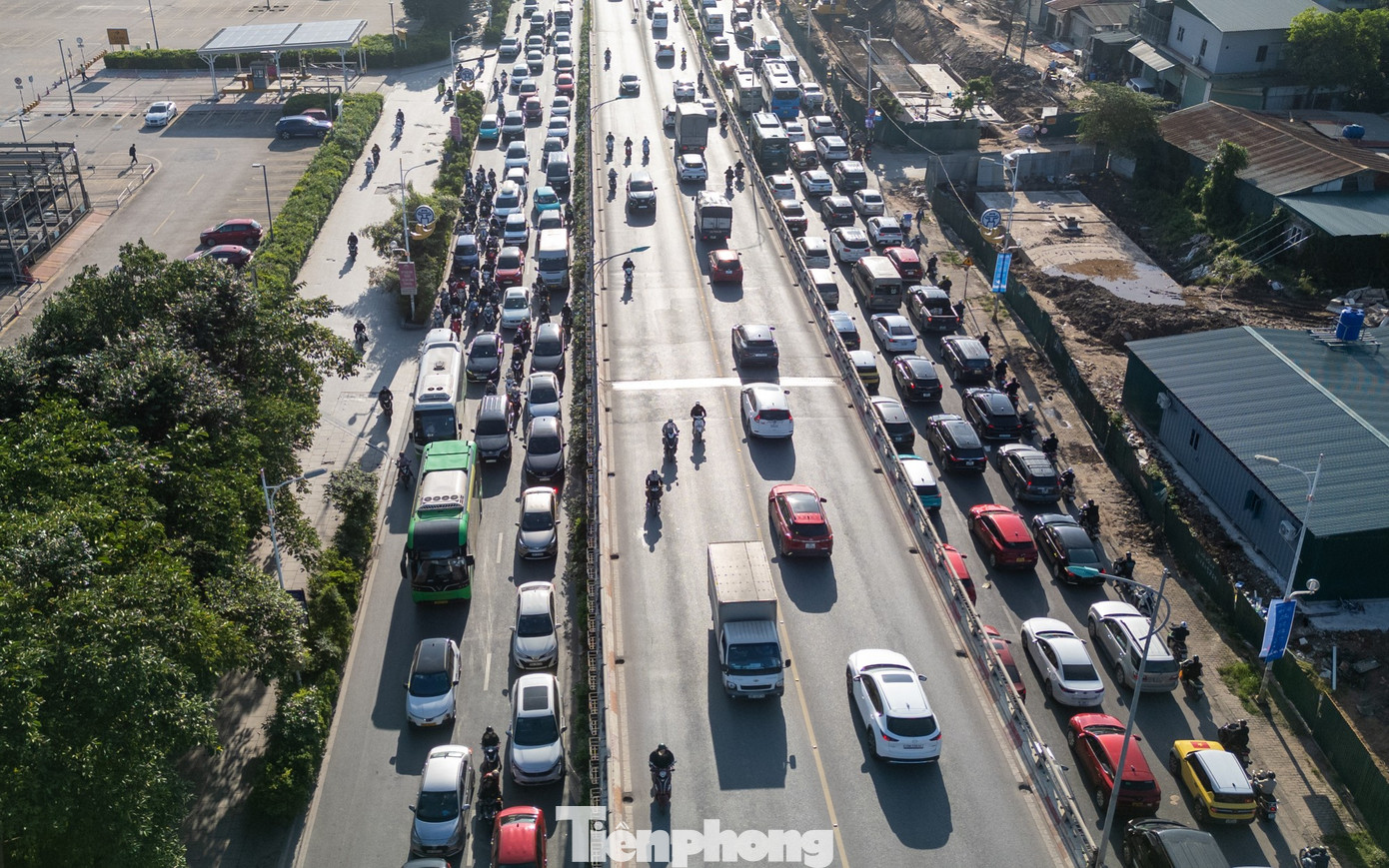 Khu vực nút giao Cổ Linh đông nghẹt xe theo hướng từ cao tốc Hà Nội – Hải Phòng đổ vào, dòng phương tiện ken đặc trong giờ cao điểm sáng.