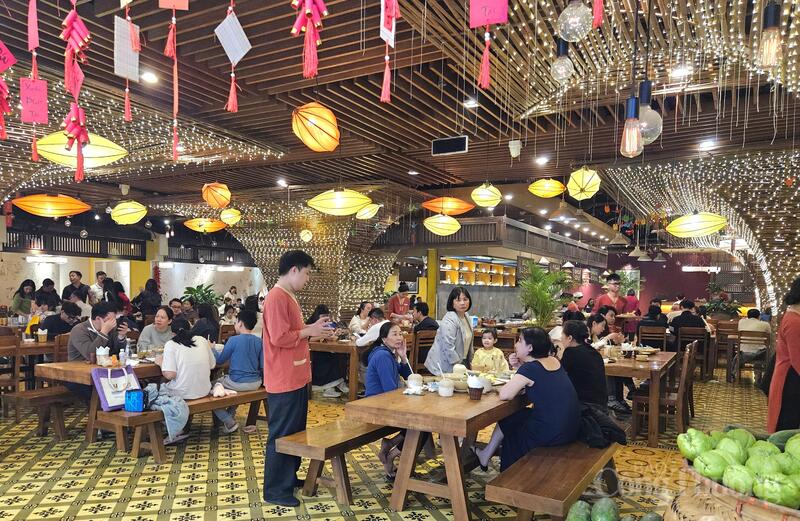 Các gia đình, nhóm bạn trẻ quây quần bên những gian hàng đa dạng, từ ẩm thực truyền thống đến món Âu, món Á, tạo nên không khí rộn ràng.