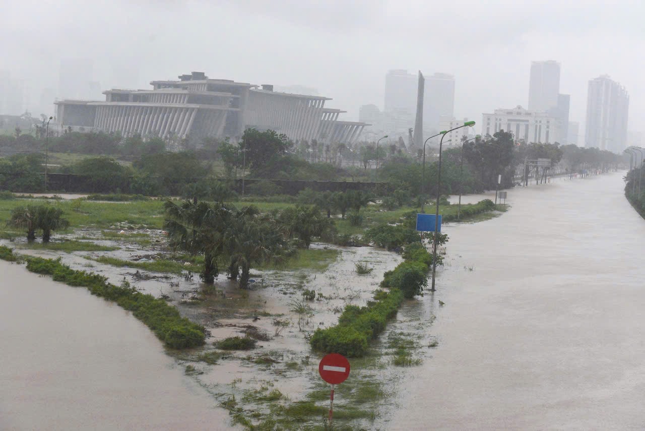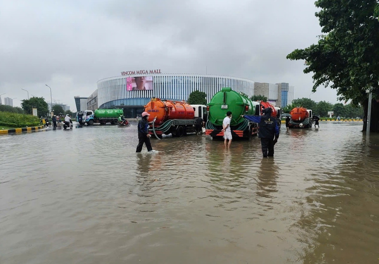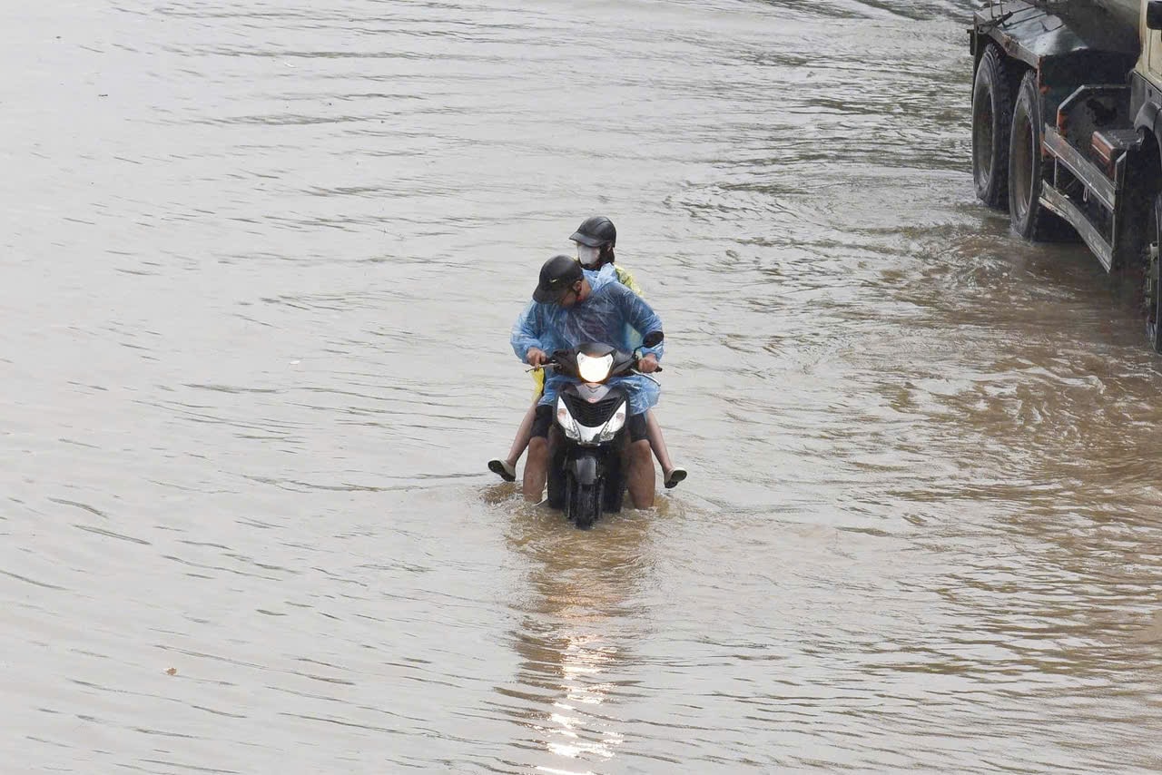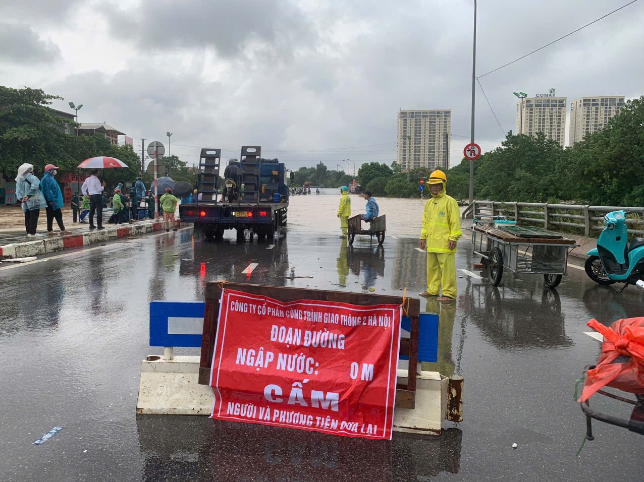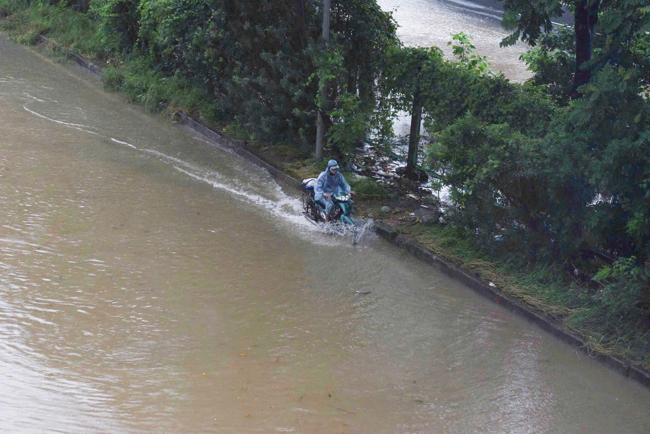 Do mưa lớn không ngớt sáng ngày 7/10, hai bên đường gom Đại lộ Thăng Long và các hầm chui dân sinh đã bị ngập nặng. Lượng nước chưa có dấu hiệu rút, ngược lại mỗi lúc tăng thêm khiến các phương tiện giao thông di chuyển rất khó khăn