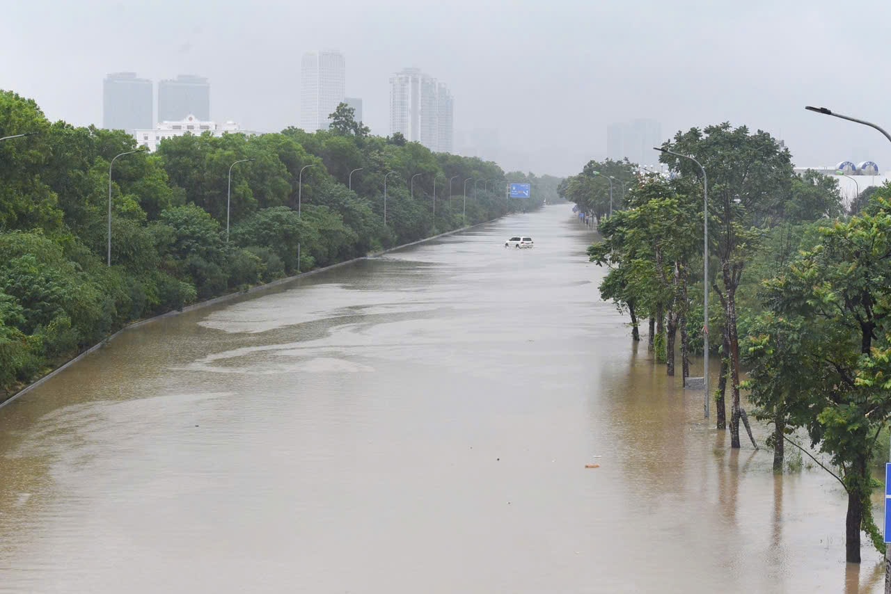 Mọi tuyến đường từ Tây Mỗ qua Đại lộ Thăng Long đều trong tình trạng ngập úng nặng