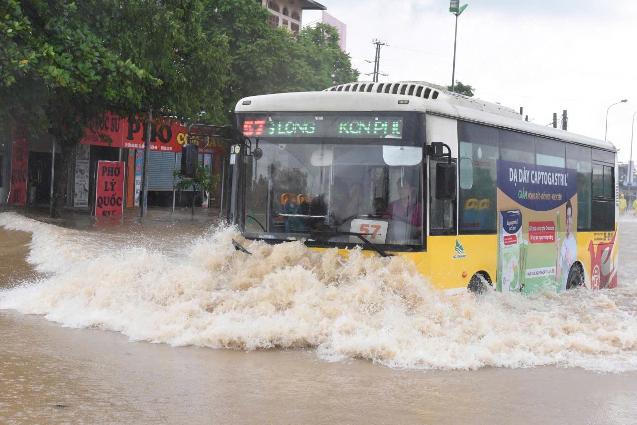 Một chiếc xe buýt "liều mình" di chuyển trong đoạn đường ngập úng