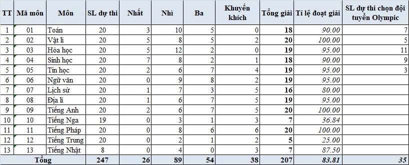Không chỉ tập trung vào một vài môn thế mạnh, học sinh Thủ đô đạt giải ở hầu hết các môn thi, từ Toán, Vật lí, Hóa học, Sinh học đến các môn Khoa học xã hội, Ngoại ngữ… Điều này phản ánh định hướng phát triển toàn diện, đồng đều giữa các lĩnh vực, thay vì chỉ đầu tư dàn trải hoặc chạy theo thành tích ngắn hạn.